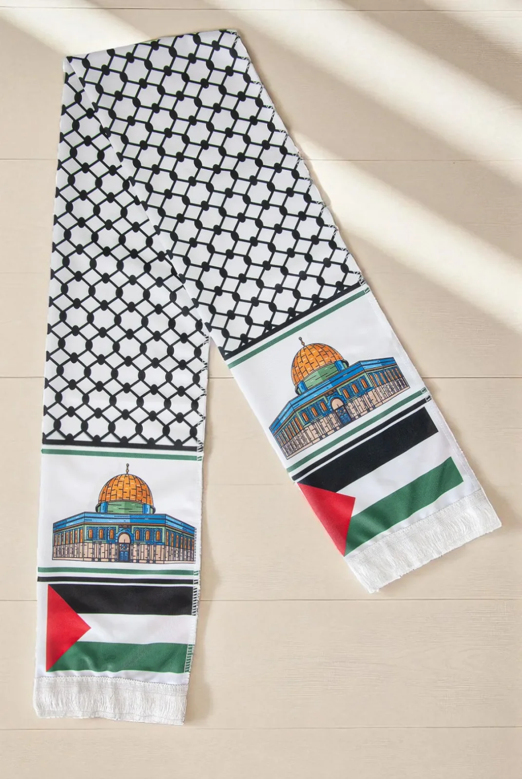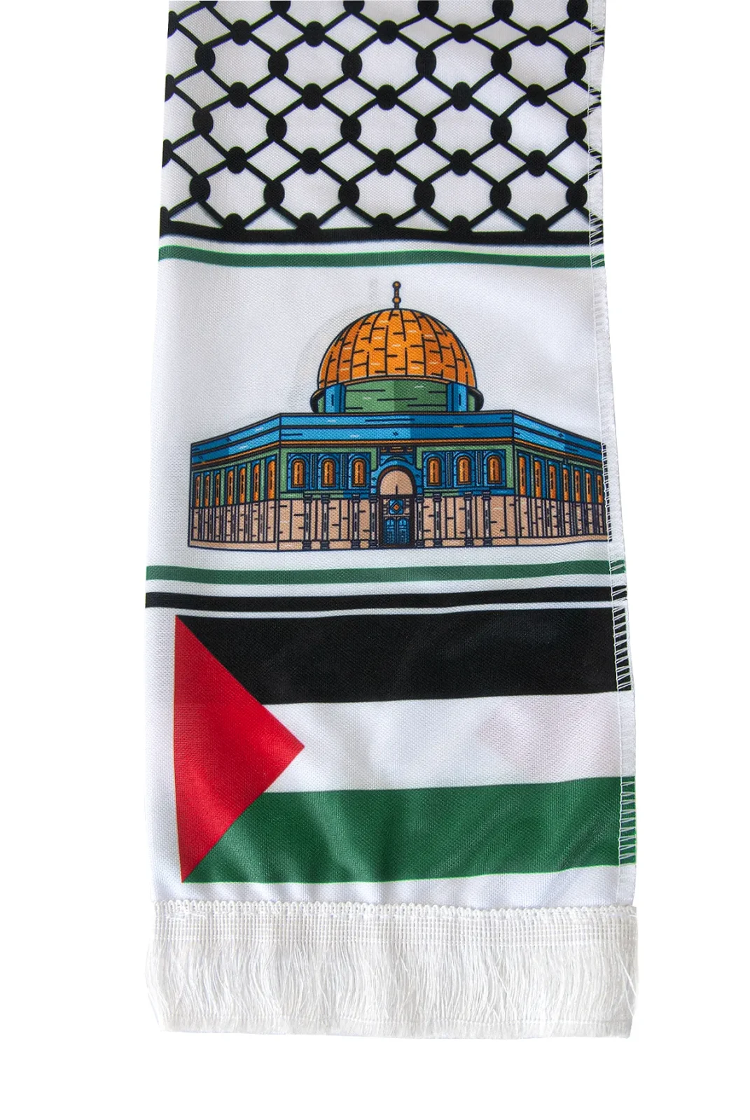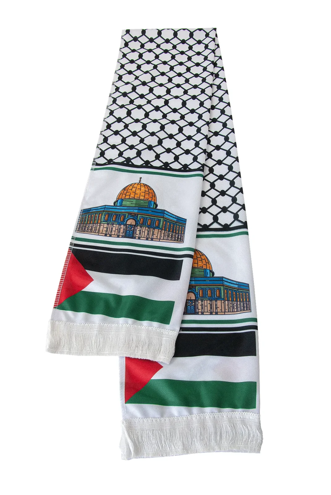 Filistin’in simgesi haline gelmiş desenleriyle tasarlanan bu Kudüs temalı atkı, zarif dokusu ve anlamlı tasarımıyla özel bir duruş sunar. Üzerinde Kudüs’ün Kubbetü’s Sahra motifi ve Filistin bayrağı renkleri yer alır. Hem manevi değeri hem de şık görünümüyle günlük kullanımda veya özel etkinliklerde fark yaratır.