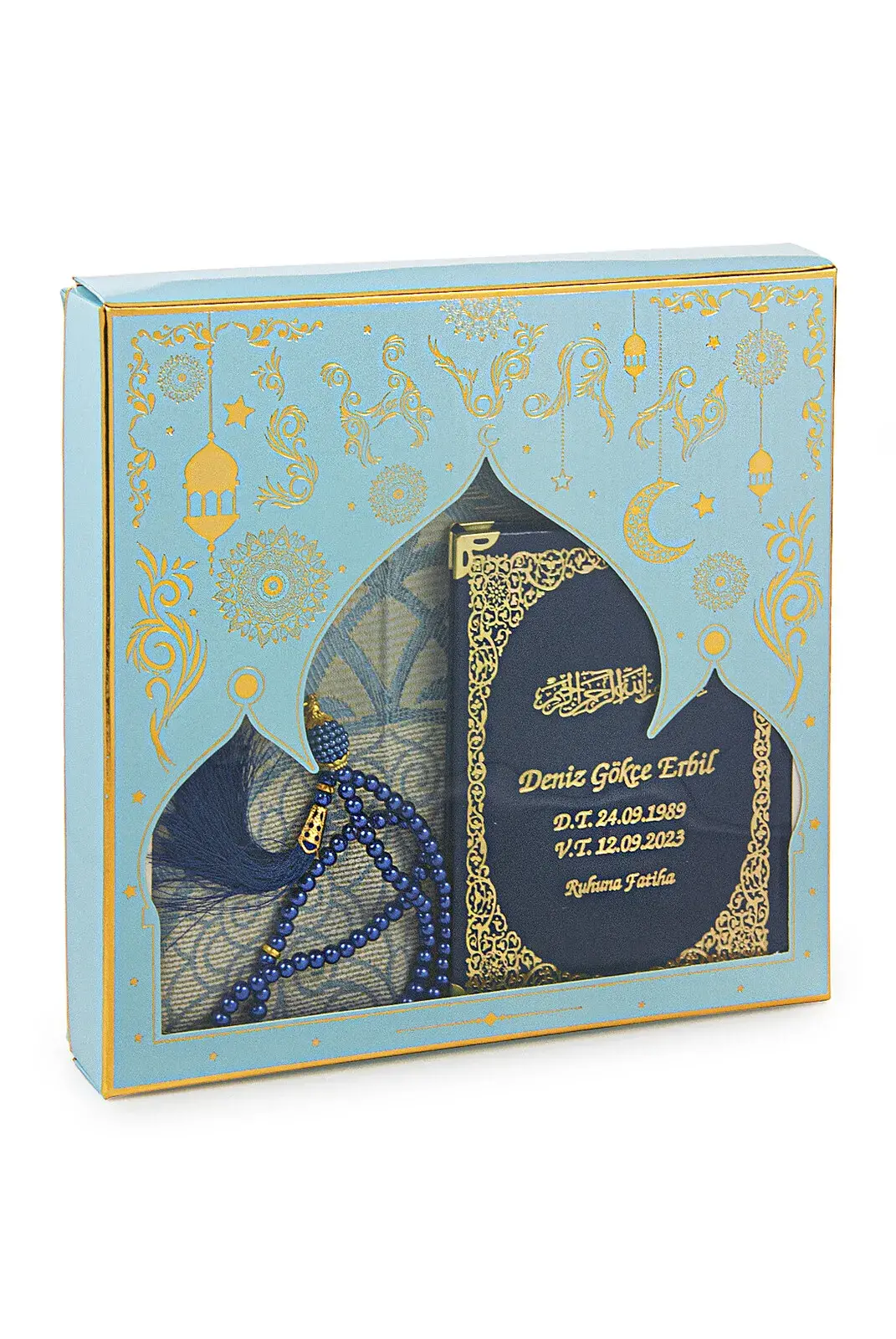 Lacivert 50 Adet İsim Baskılı Deri Ciltli Çanta Boy Yasin Kitabı Seccade Seti Mevlit Hediyesi