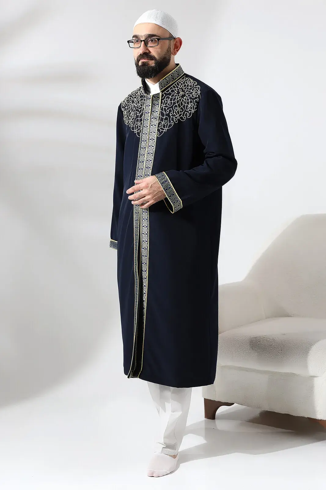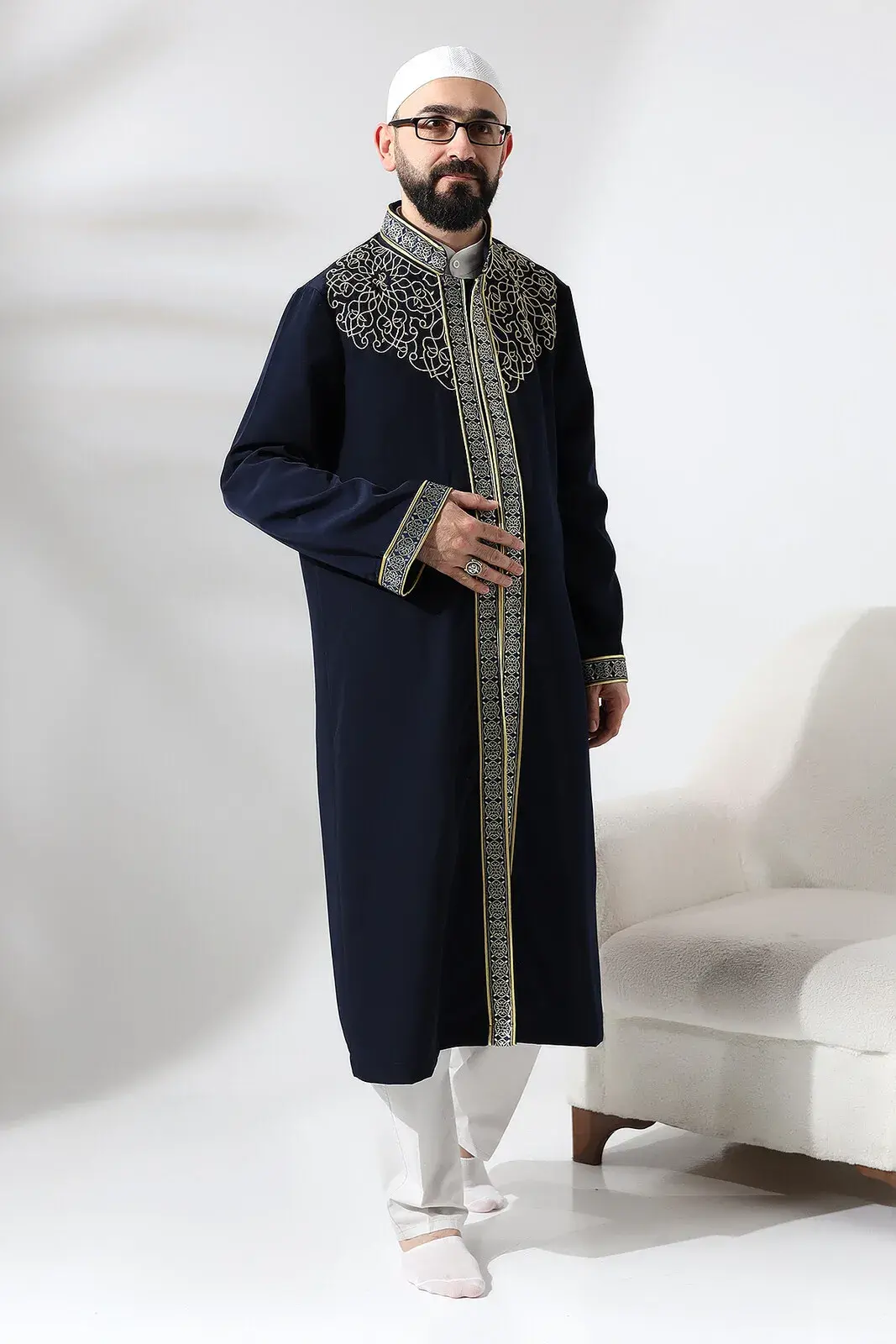 Lacivert Hakim Yaka Erkek Namaz Elbisesi Şerit Nakış İşlemeli İmam Cübbesi