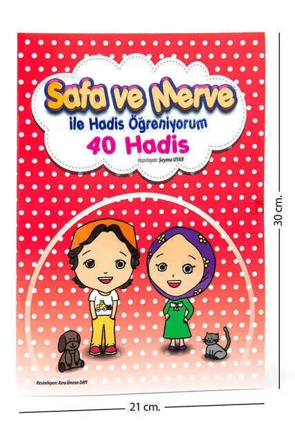 I Learn Hadith with Safa and Merve 40 Hadith Prepared by: Şeyma Uyar Illustrated by: Uncle Azra Ümran Language Turkish Number of Pages: 40 Pages Skin Type: Hardcover Paper Type: 1. Pulp Paper Size: 21 x 30 cm It is an Artifact to Help Your Children Learn Hadith-i Sharifs in a Fun Way