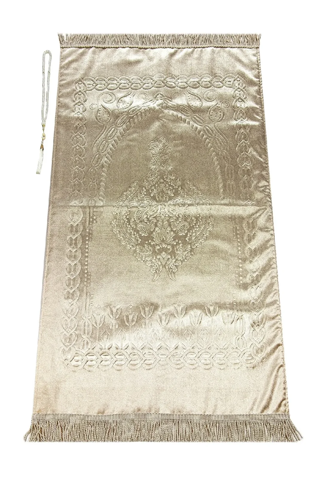 Set içerisindeki ipeksi polyester dokuma, sünger dolgulu ve bulyon örgü saçaklı seccade; yumuşak dokusu ve kaliteli işçiliği ile konforlu bir ibadet deneyimi sunar. Dantelli baş örtüsü ise zarif görünümüyle hem günlük kullanım hem de özel günler için uygundur.