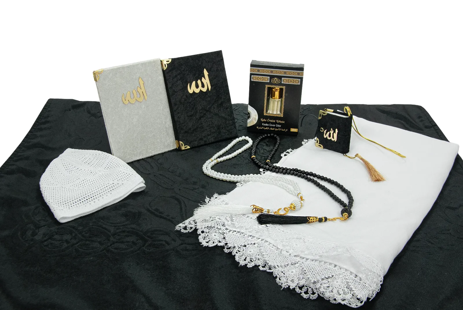 Mini Kur’an-ı Kerim, iki adet kadife kaplı Yasin-i Şerif ve iki adet 99’lu inci görünümlü tesbih, seti manevi açıdan zenginleştirirken; takke ve esans gibi tamamlayıcı parçalar da kullanım bütünlüğü sağlar.