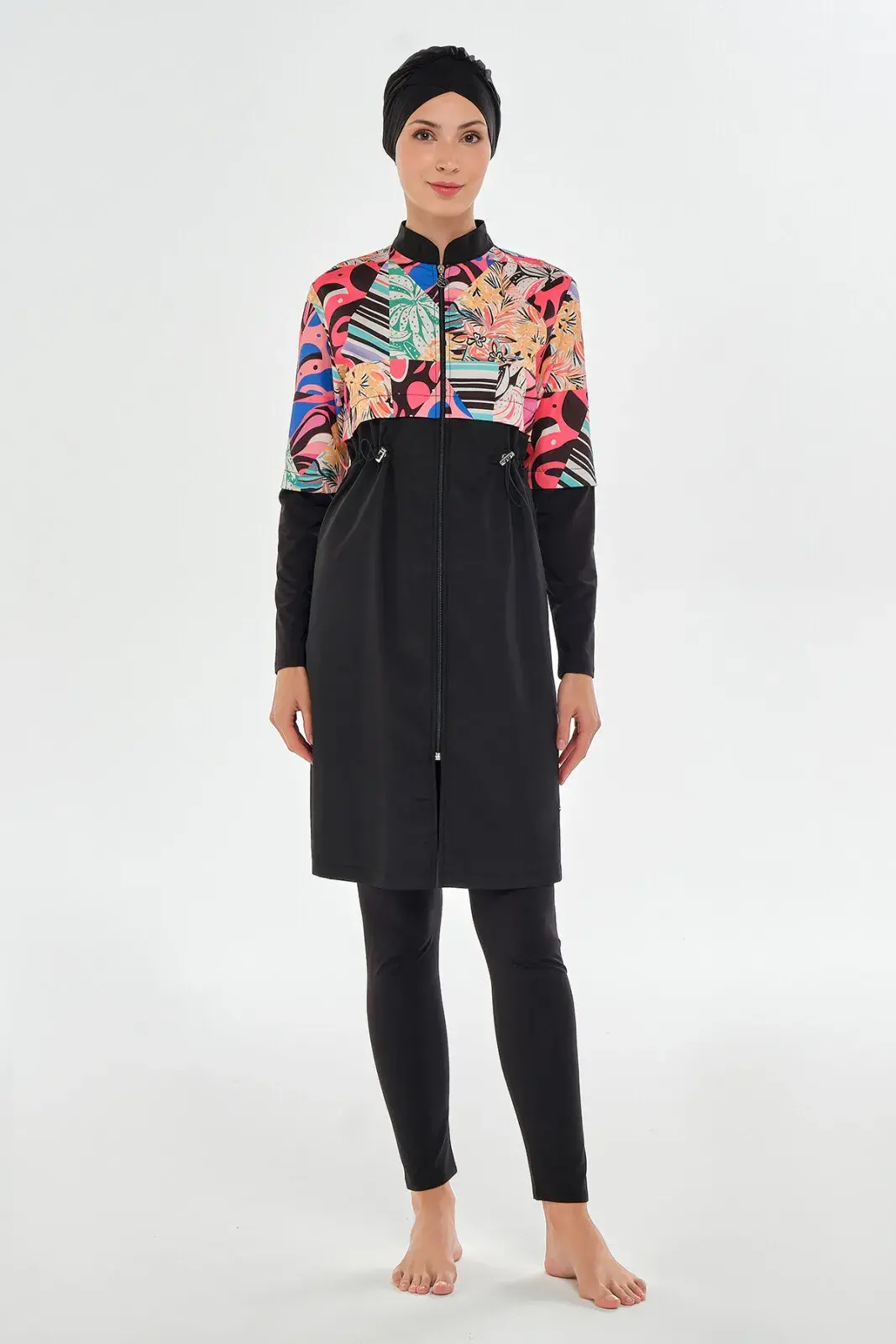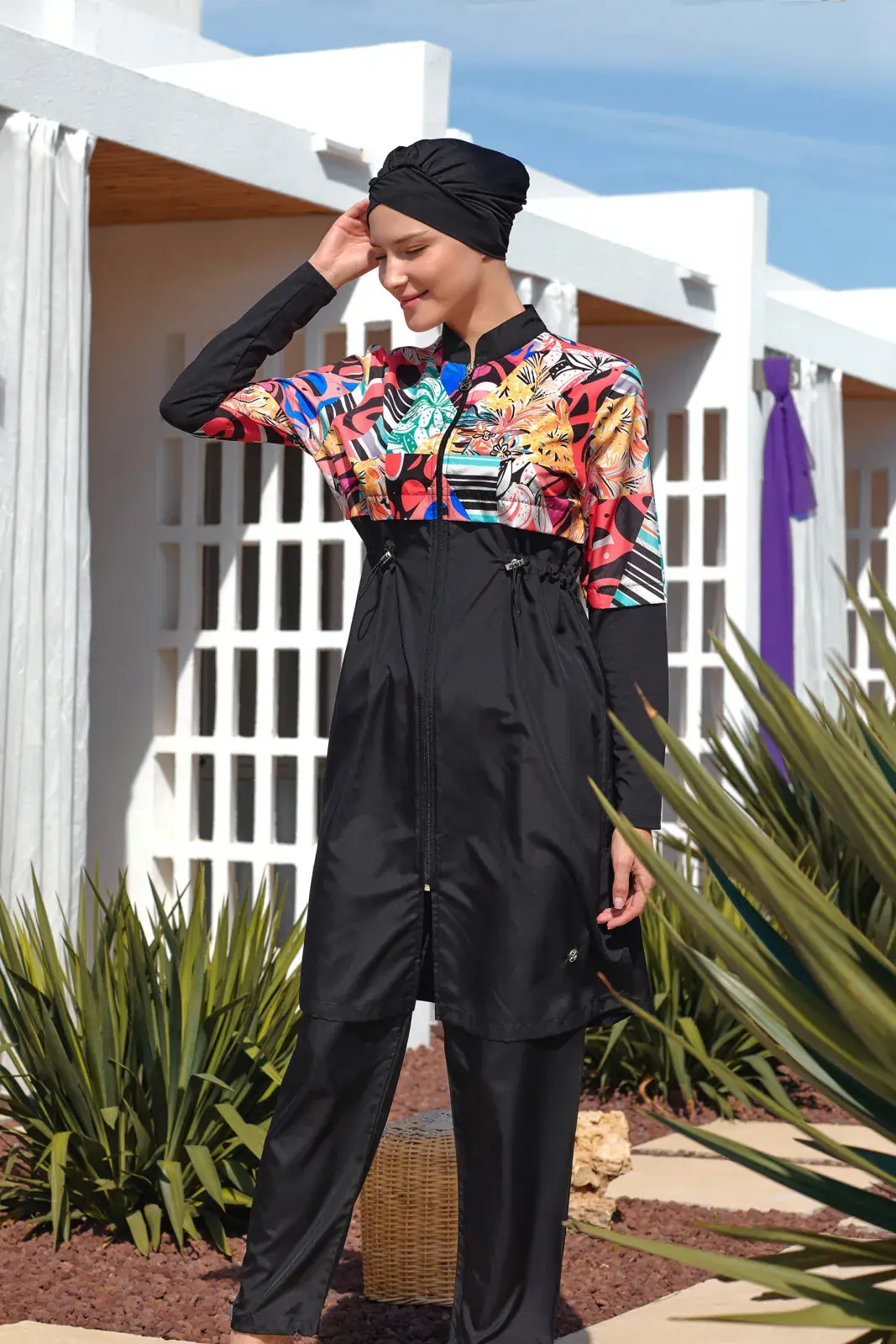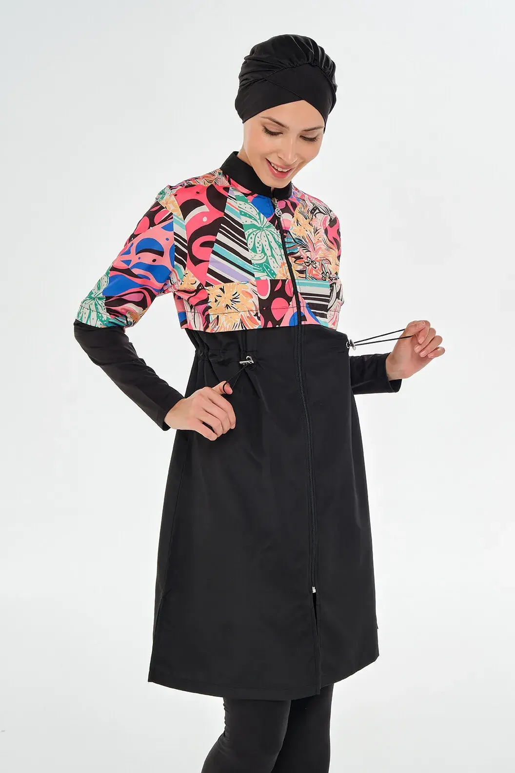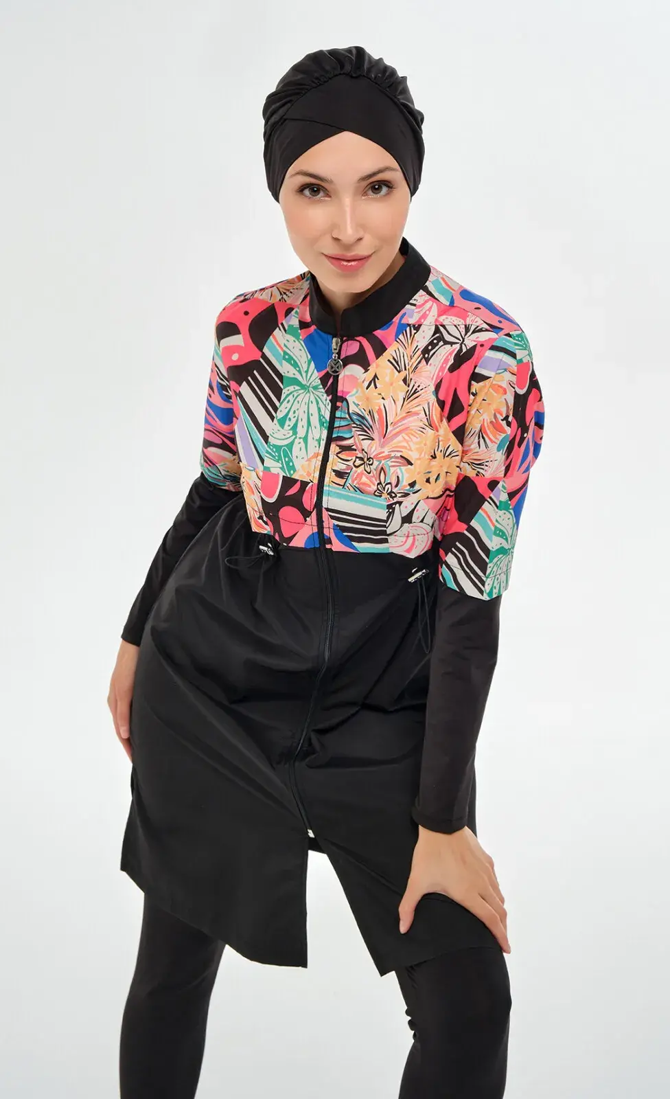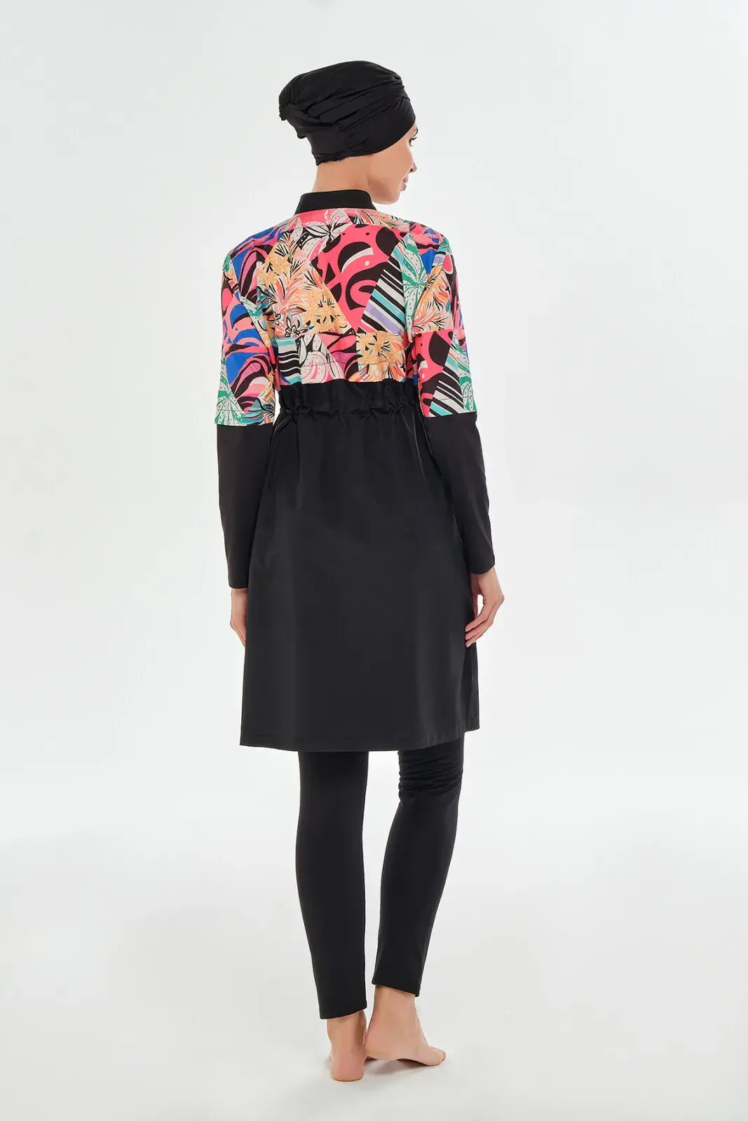 Tropikal desenli üst bölüm, canlı ve enerjik stil