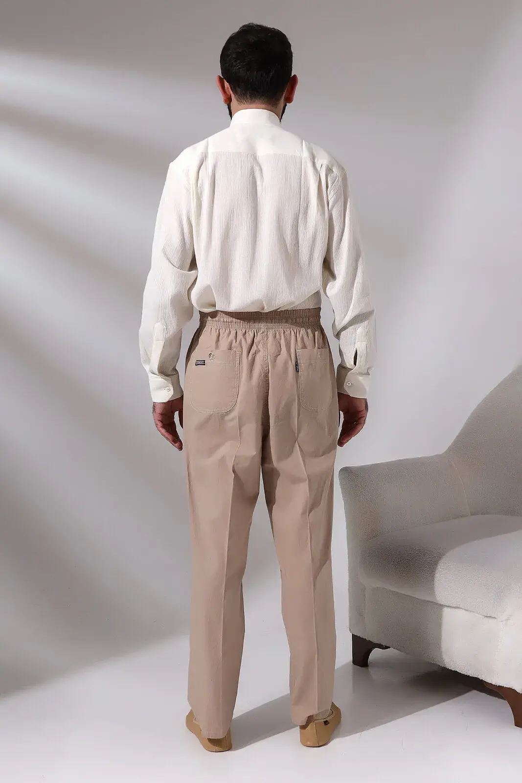 Men's Beige Çınar Casual Cut Elastic Waist Hajj and Umrah Linen Shalwar Trousers