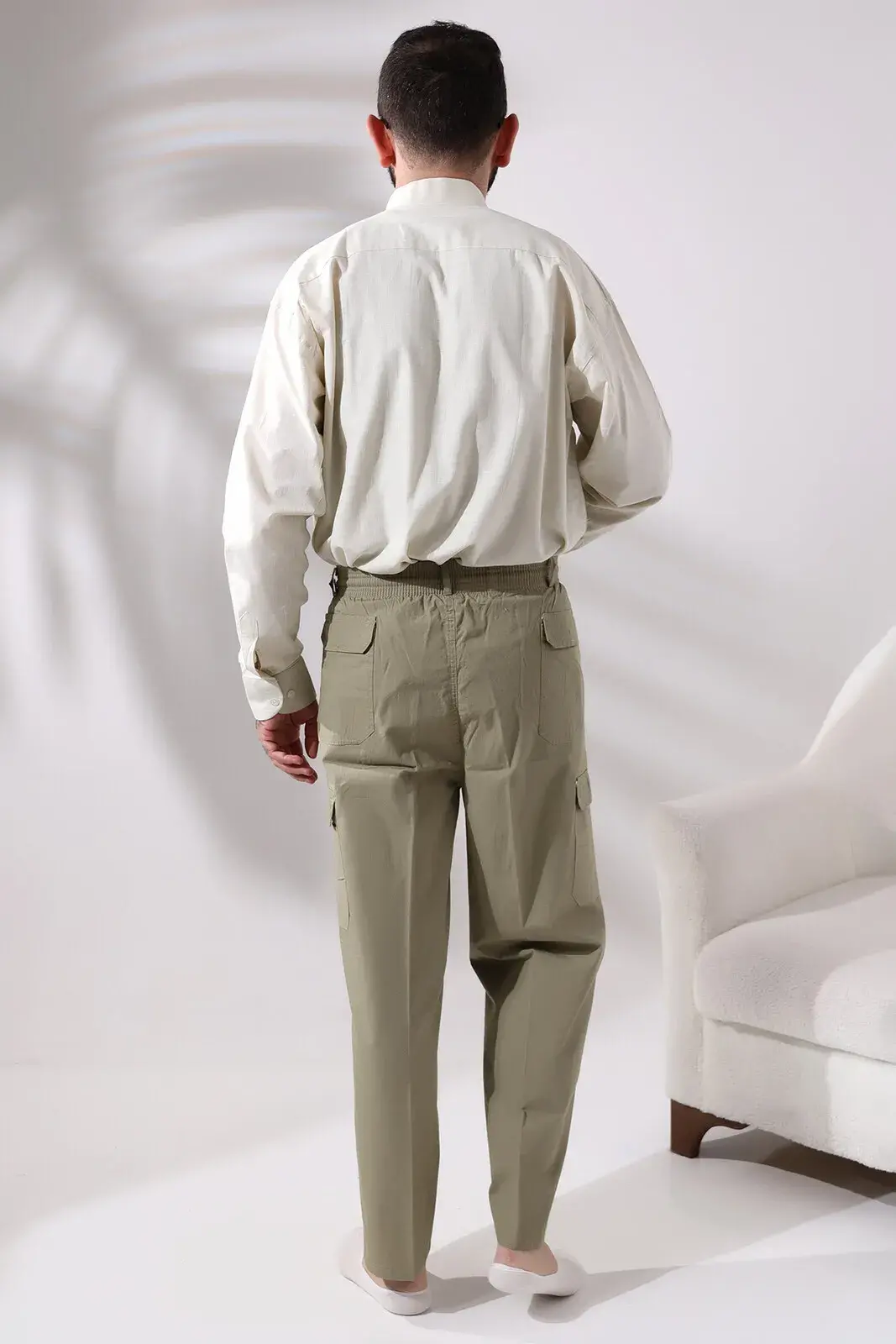 Men's Light Khaki Side Pocket Relaxed Cut Cargo Shalwar Trousers with Elastic Waist