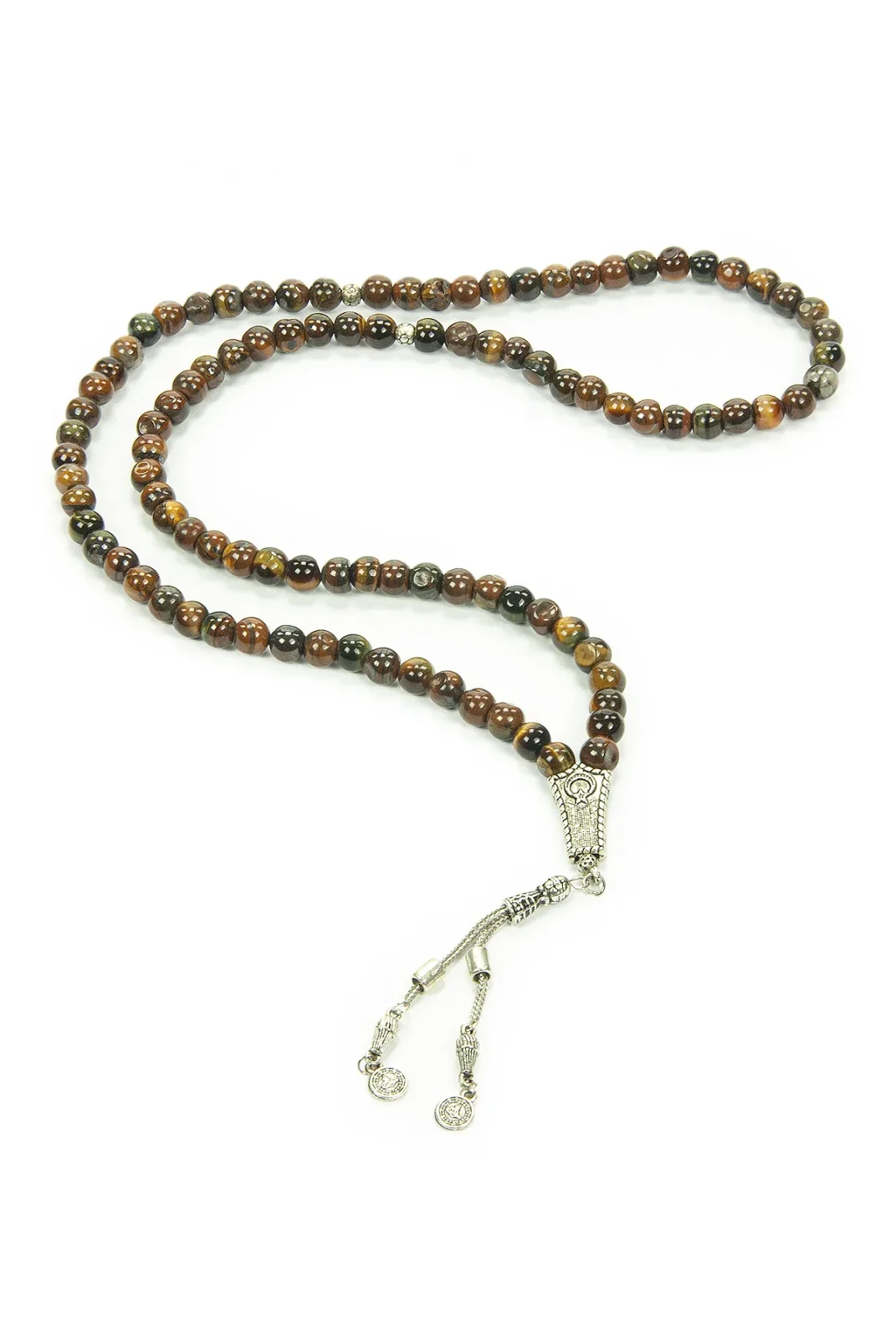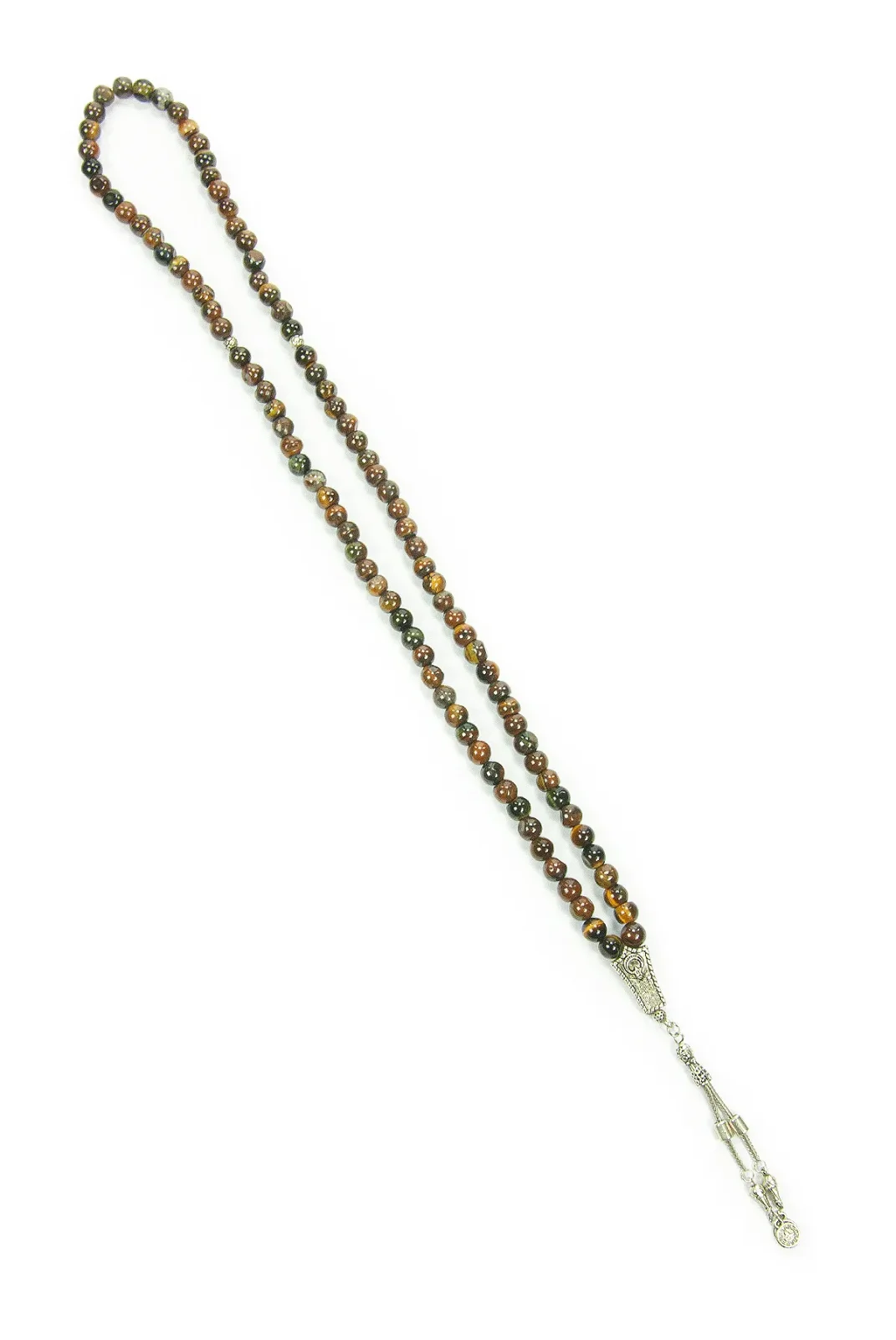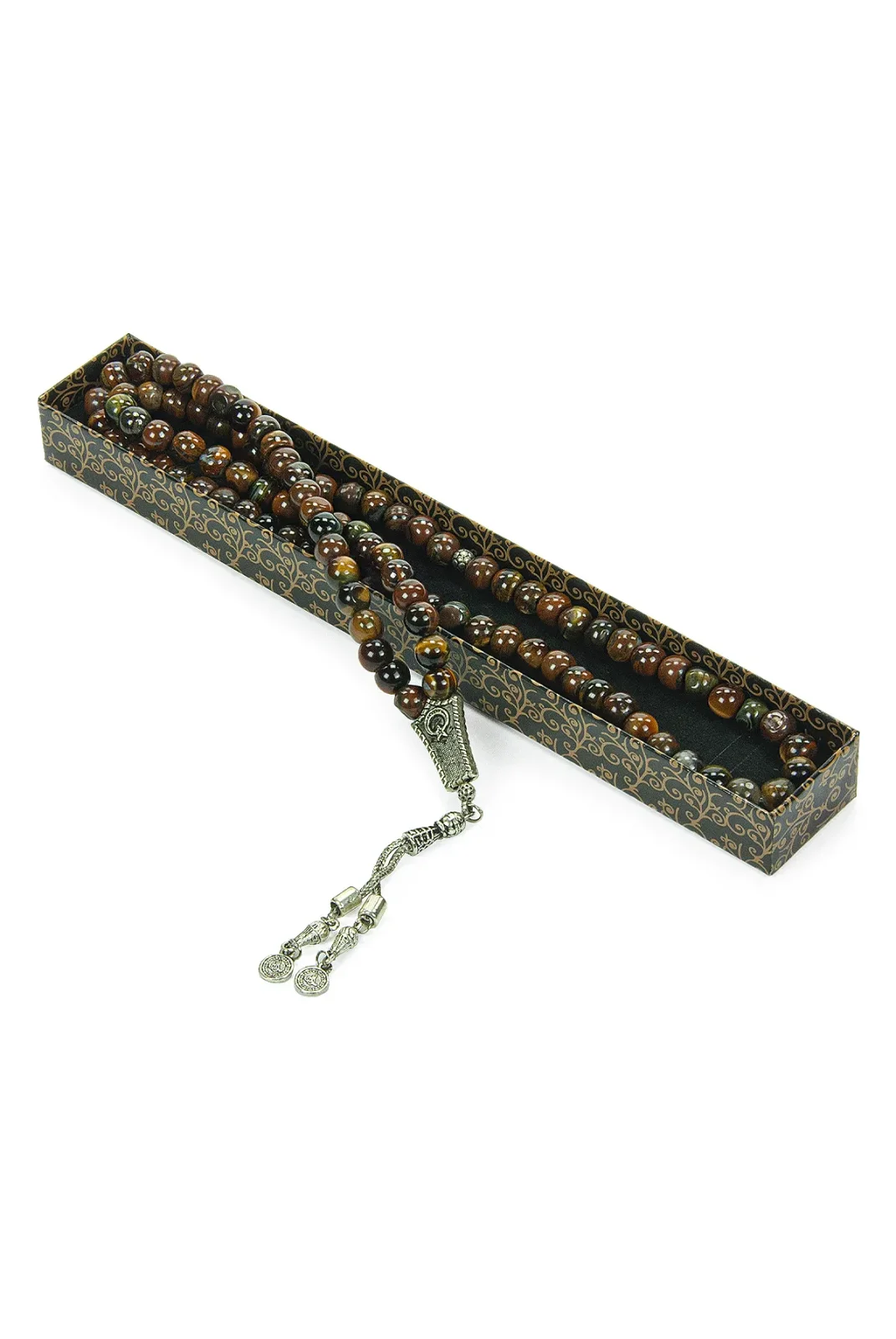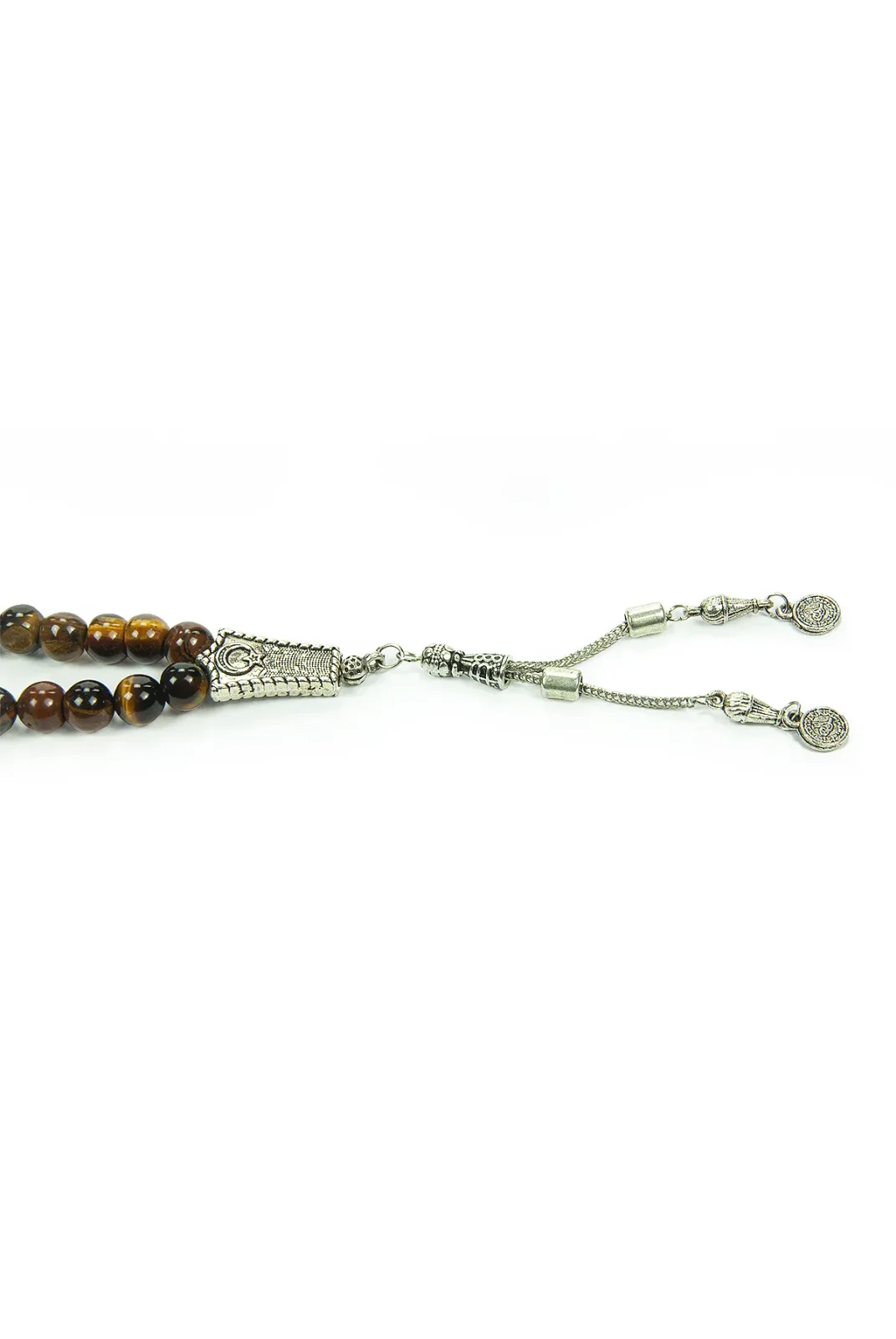 Kaplan gözü taşının güçlü enerjisiyle birleşen bu 99'lu tesbih, ikili Osmanlı tuğralı metal püskülüyle tarihi ve estetik bir dokunuş sunar. Küre kesimiyle elde rahat bir tutuş sağlar, günlük kullanım ve hediye için uygundur.