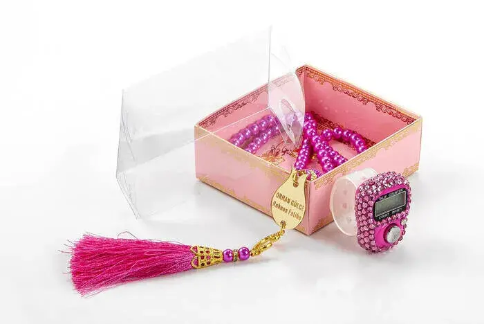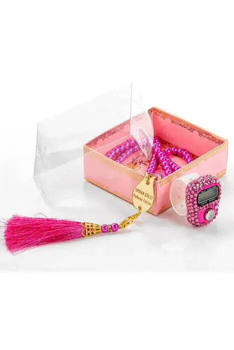 Mevlid Gift Set With Plexi Pearl Rosary and Zikirmatik Special For Your Name - Pink Color