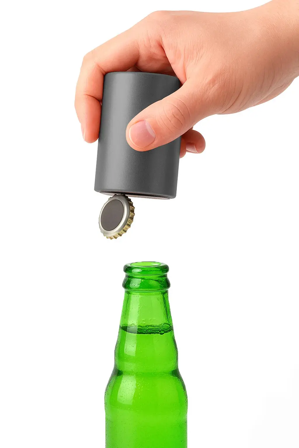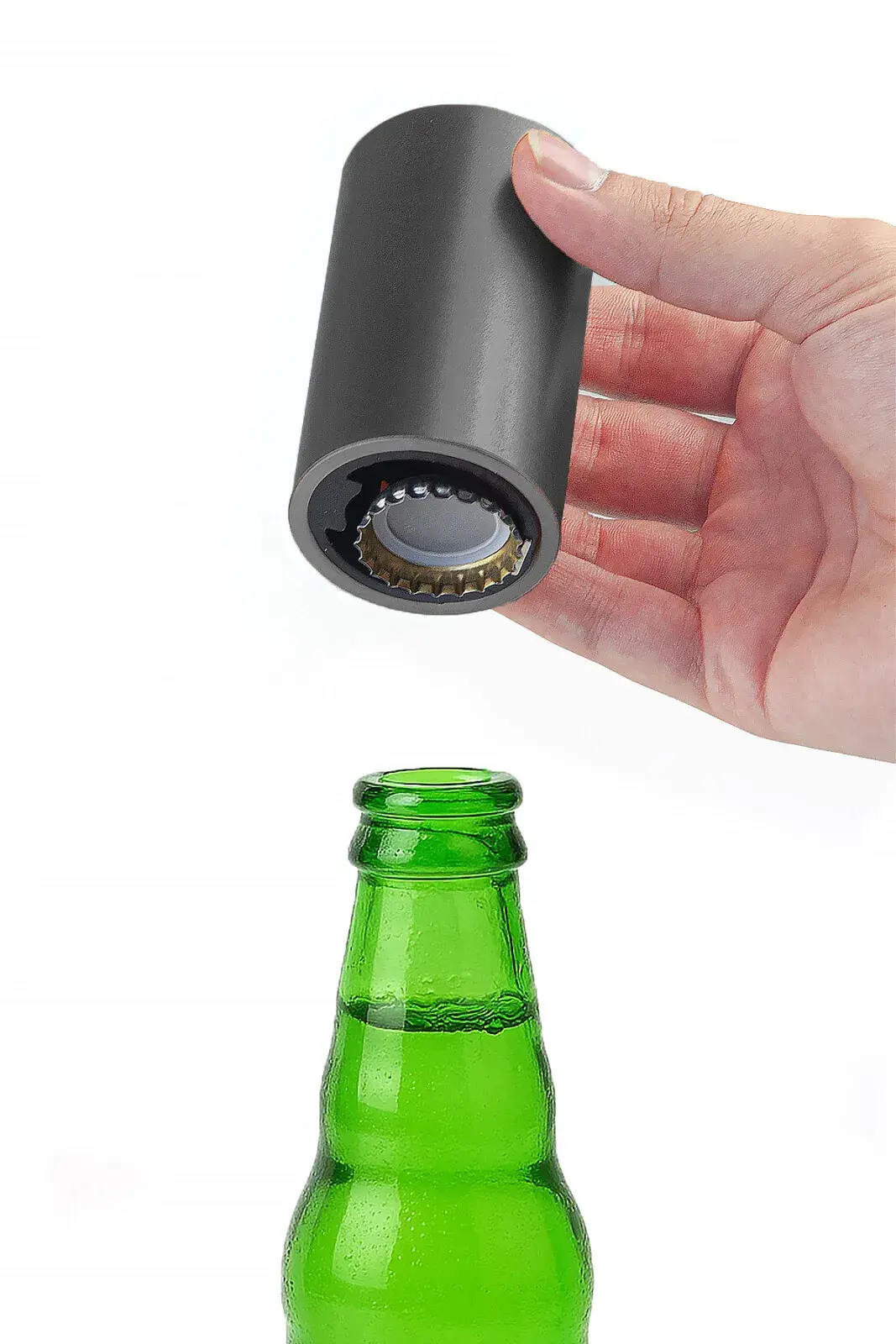 Şişe açmak artık çok kolay. Soğuk içeceğinizin kapağını açmak için yapmanız gereken tek şey Otomatik Şişe Açacağı şişenize üstten yerleştirmek, hafifçe bastırmak ve çekmek.