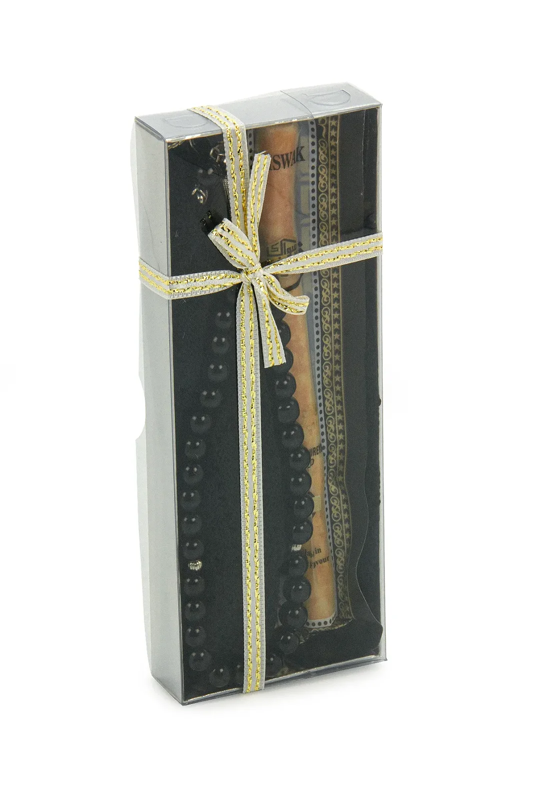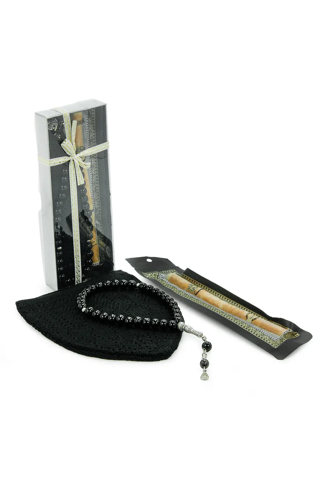 Bu set, hem günlük namazlarda hem de Hac ve Umre gibi kutsal yolculuklarda kullanıma uygun olan şık bir hediyelik setidir. Setin içinde yer alan namaz takkesi, erkeklerin namaz kılarken rahatça kullanabileceği kaliteli bir tasarıma sahiptir. Misvaklı tesbih ise, geleneksel ve şık bir tasarımla, tesbih çekerken keyifli bir deneyim sunar.