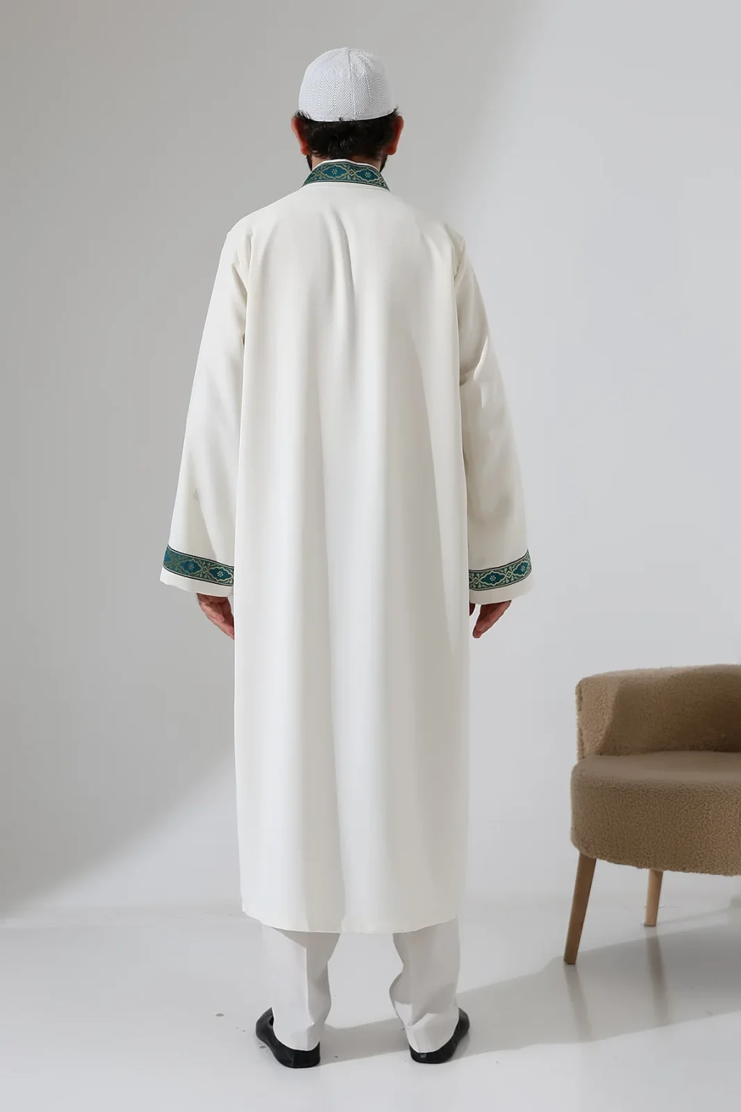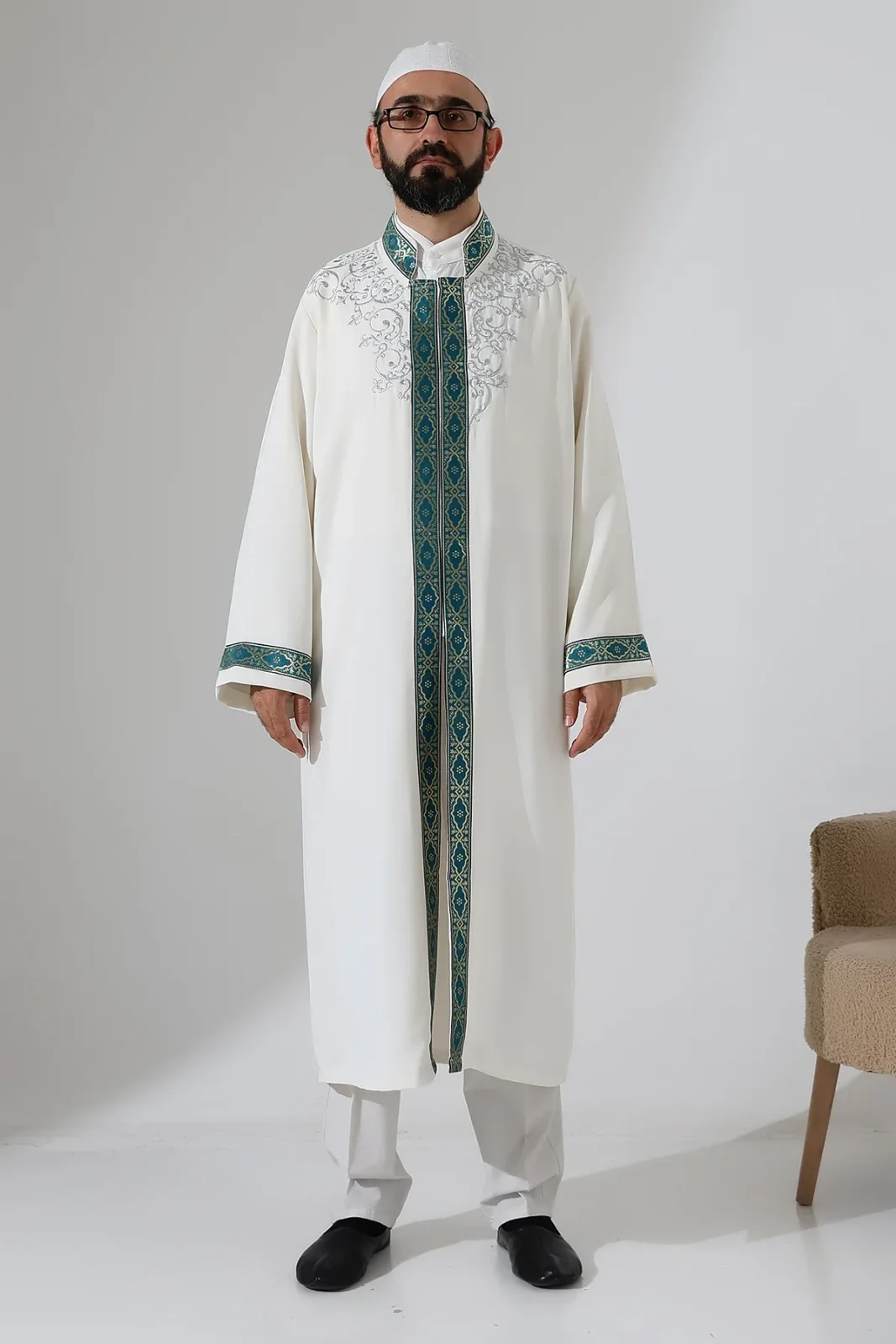 Nakış İşlemeli Hakim Yaka İmam Cübbesi, Çıt Çıtlı Cepli Namaz Cübbesi Yeşil Bordürlü - Krem