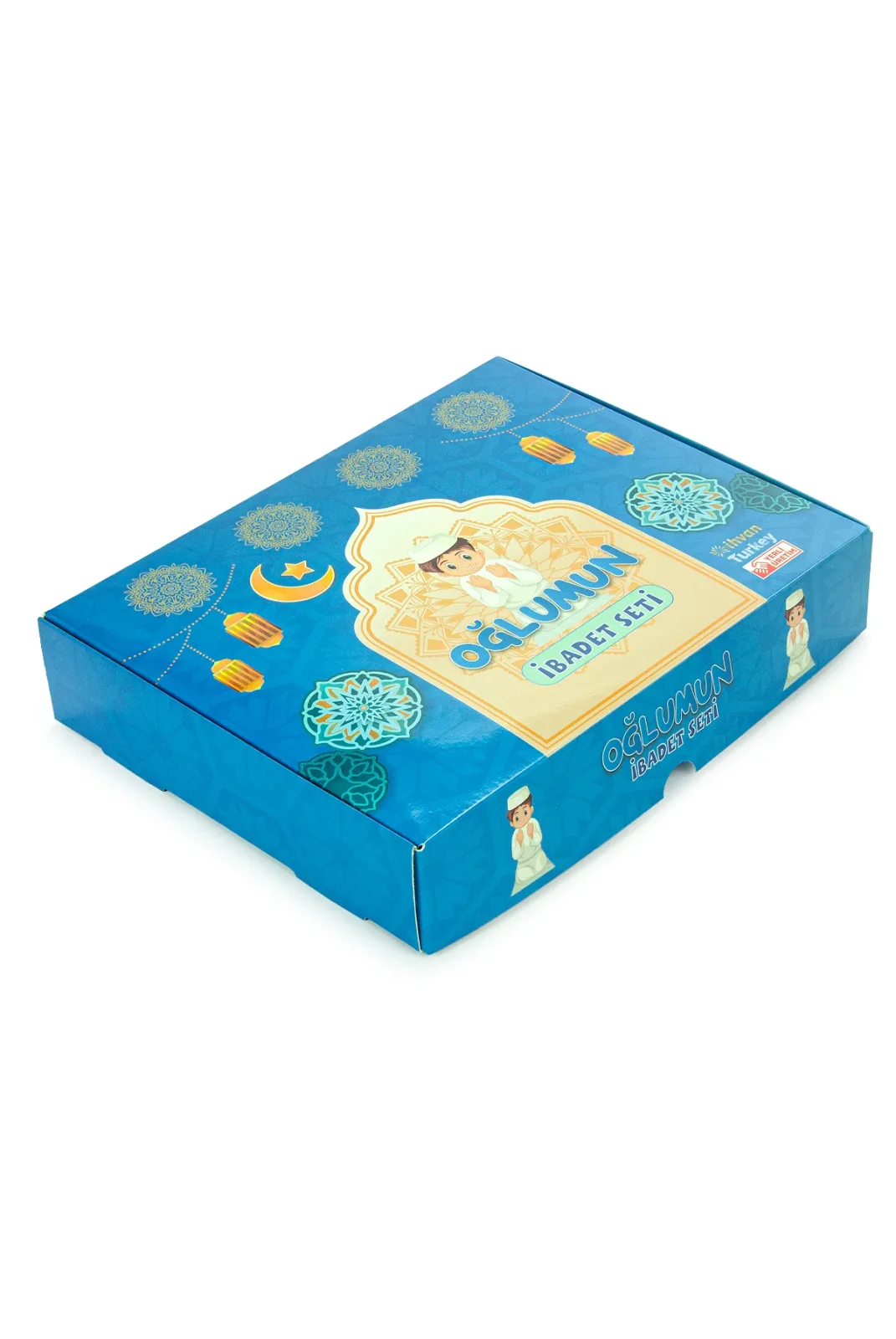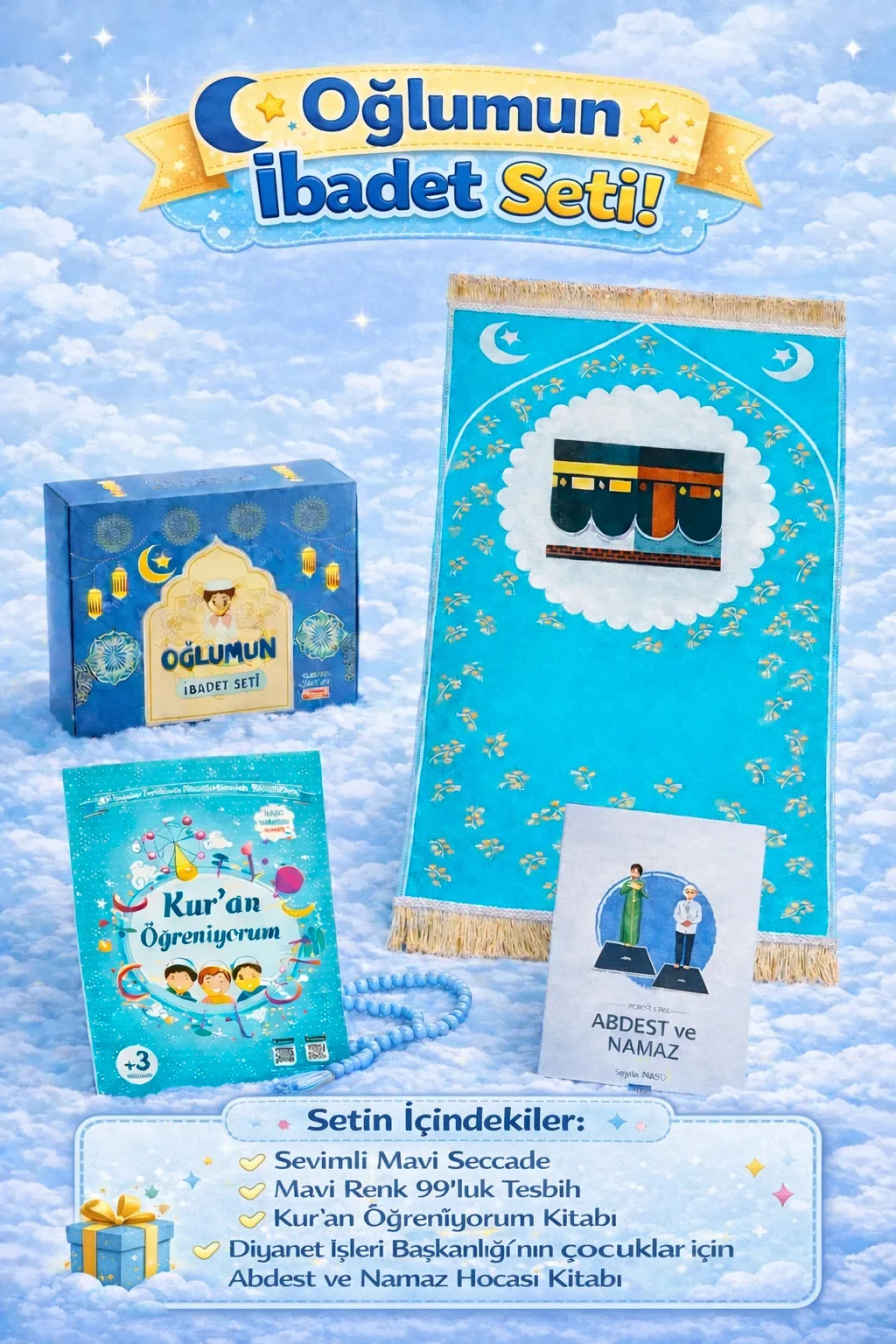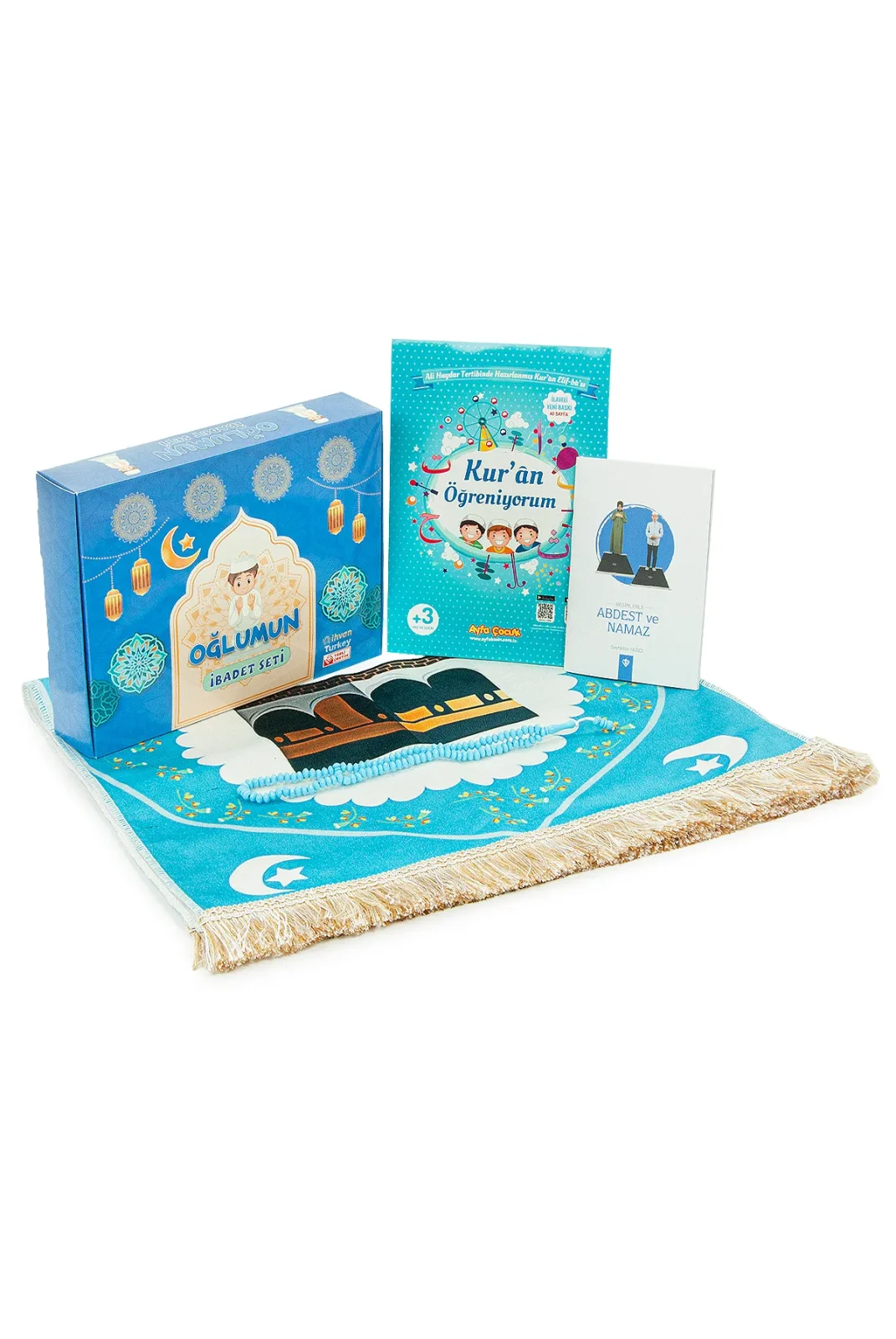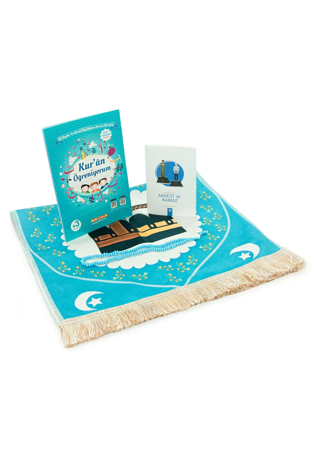 Oğlumun İbadet Seti Kabe Desenli Erkek Çocuk Seccade, Elifba ve Namaza İlk Adım Seti