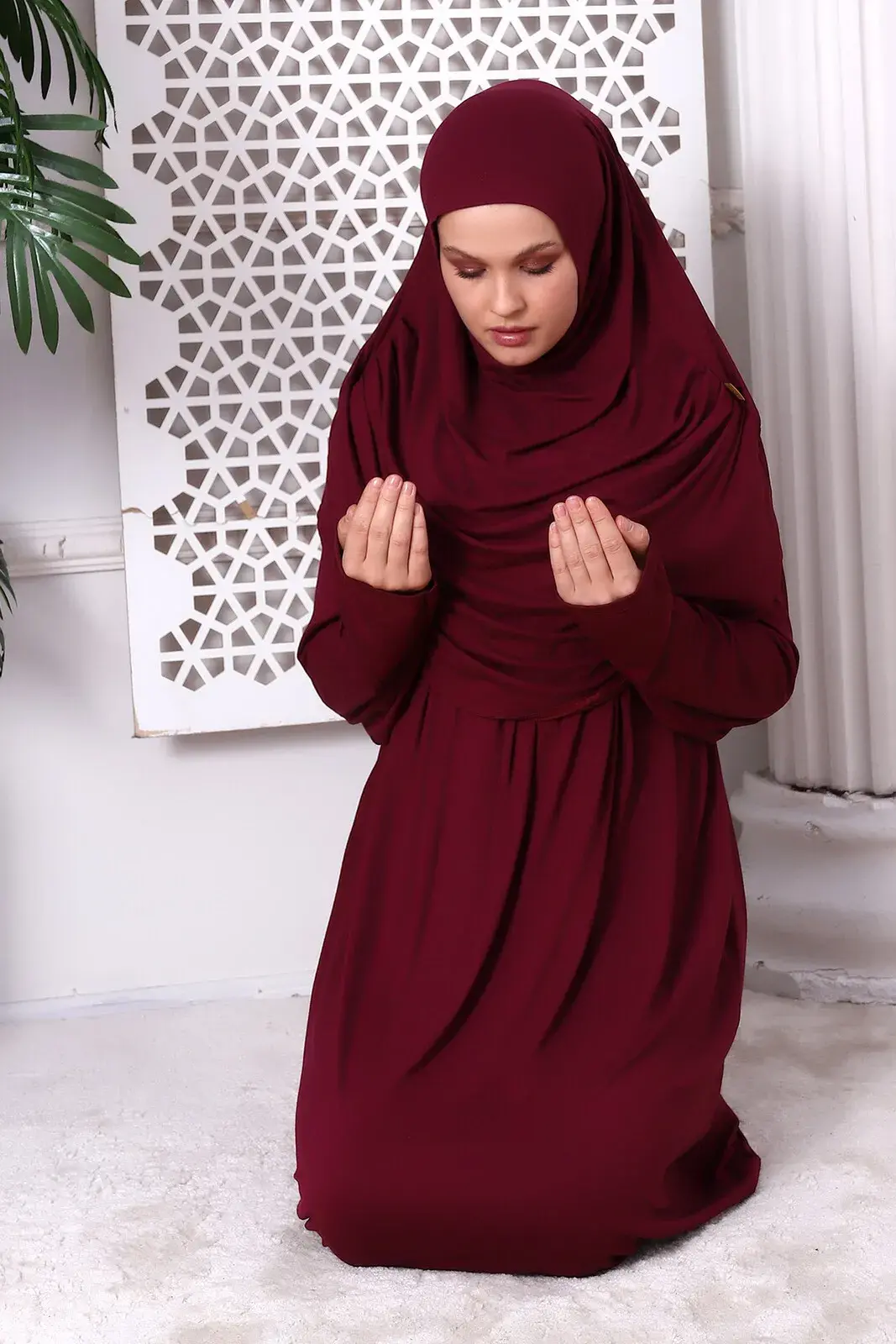 One Piece Practical Hijab and Robe Prayer Dress 8015 Claret Red