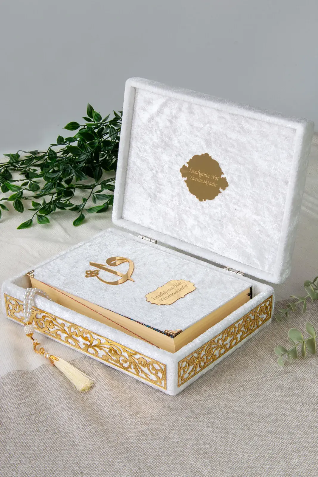 Özel Elif Vav Pleksi Süslemeli Hediyelik Kadife Kaplı Kutulu Kuranı Kerim Beyaz