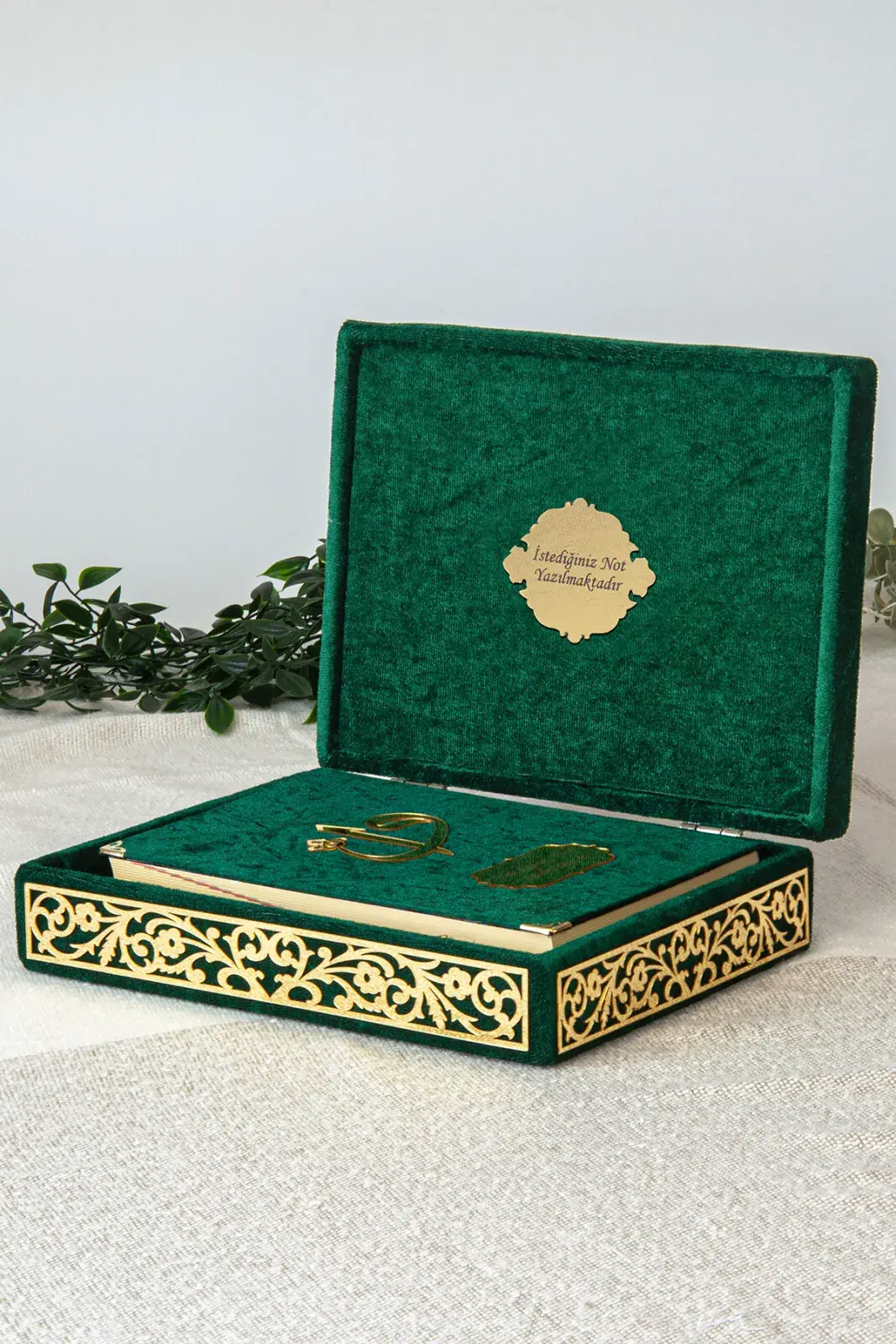 Özel Elif Vav Pleksi Süslemeli Hediyelik Kadife Kaplı Kutulu Kuranı Kerim Yeşil