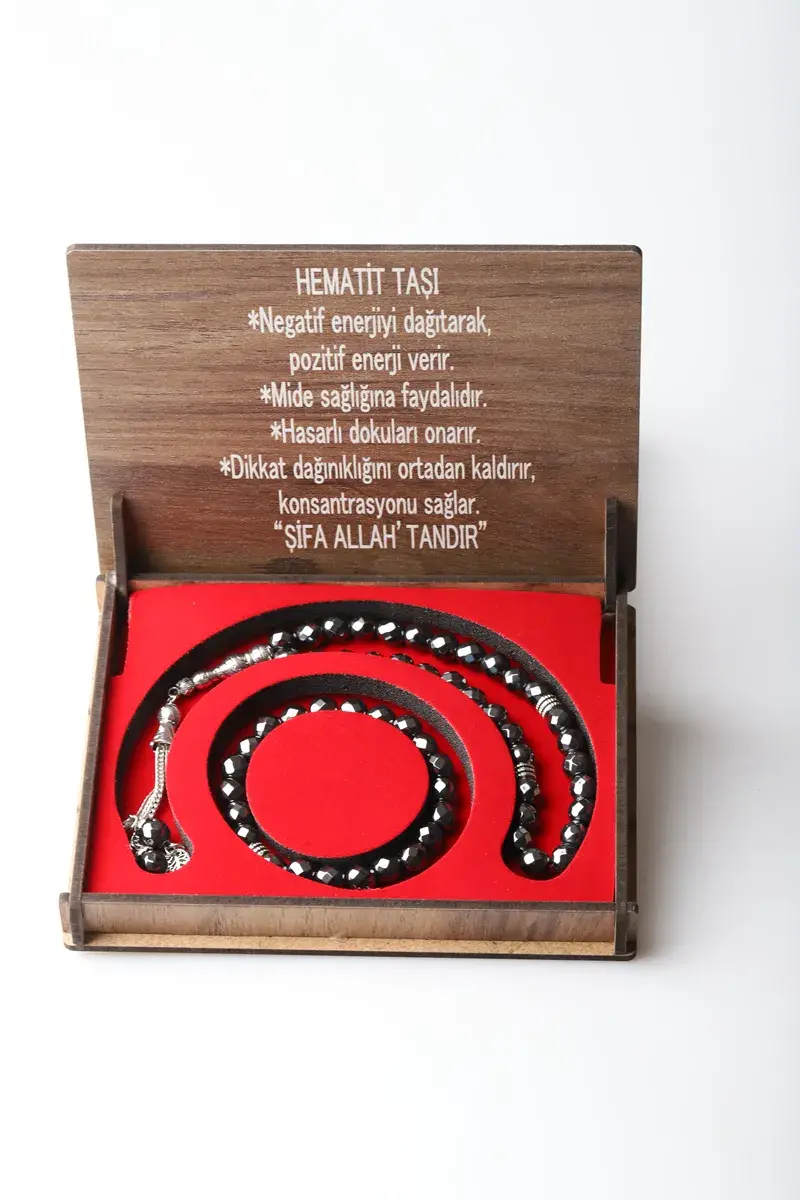 Özel Kutulu Doğal Hematit Taşı Tesbih ve Bileklik Seti