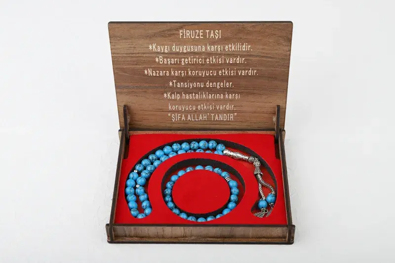 Özel Kutulu Mavi Doğal Firuze Taşı Tesbih ve Bileklik Seti