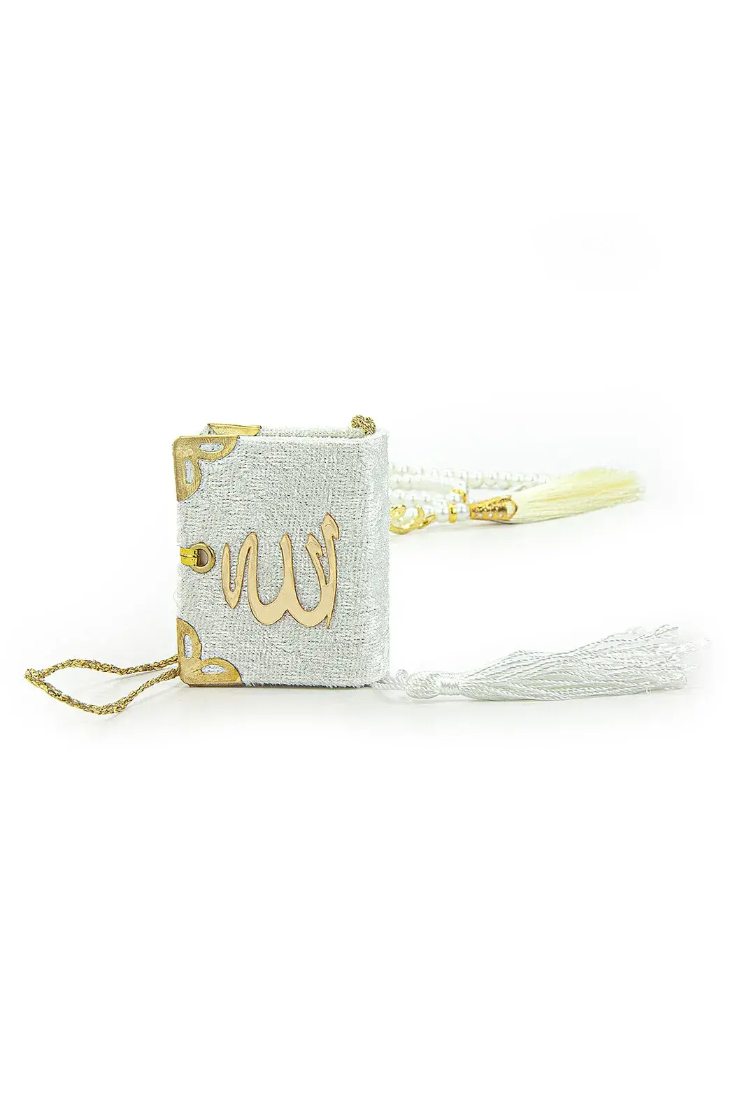 Özel Tasarım Silindir Kutulu İnci Tesbihli Mini Kuranı Kerim Mevlüt Hediyelik Seti Beyaz