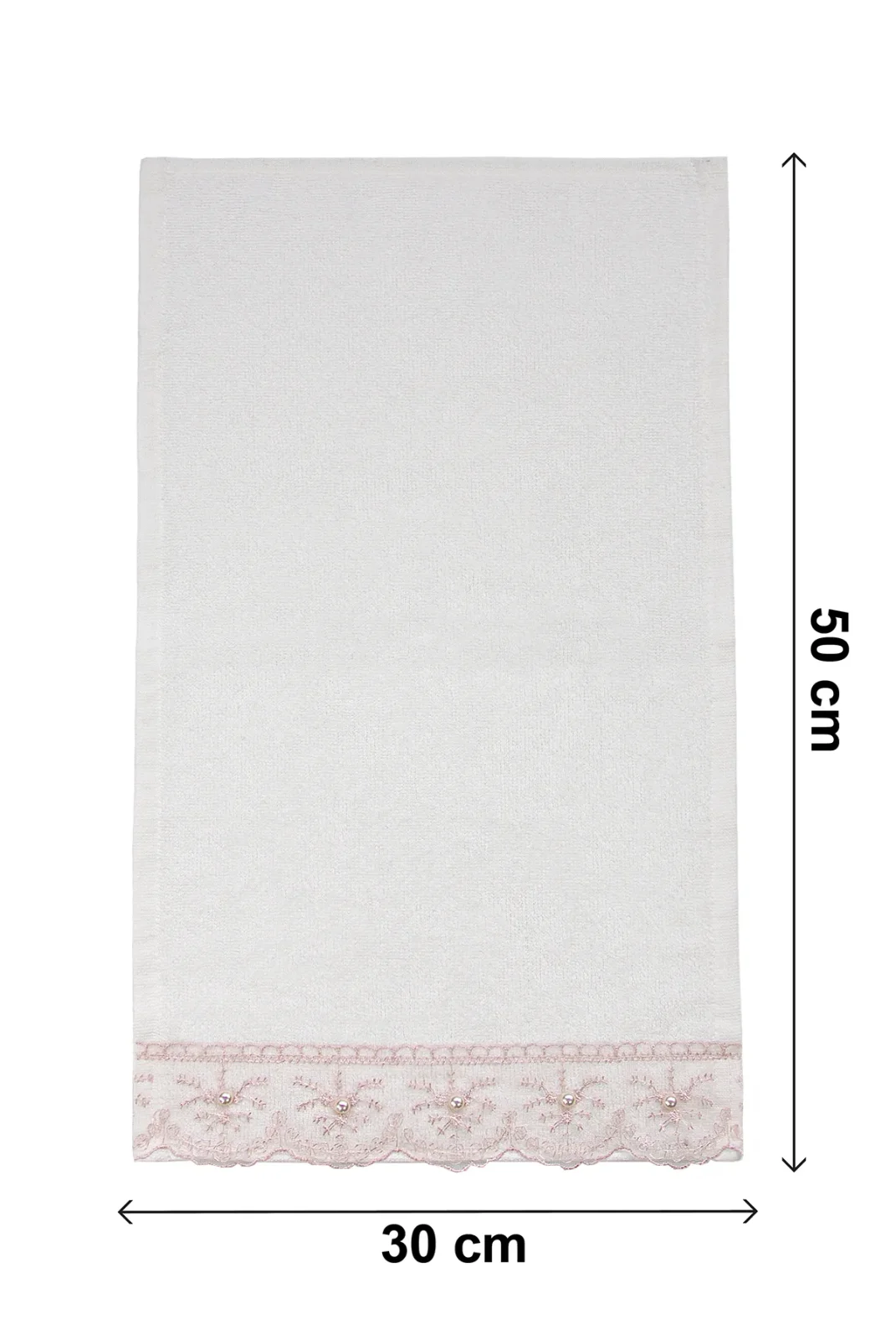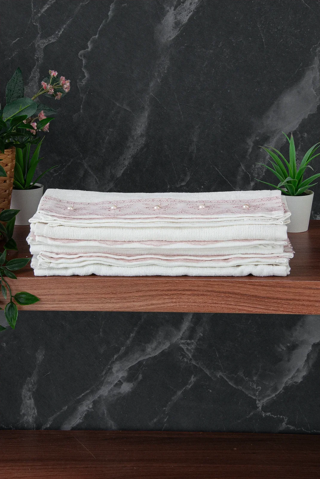 % 100 Pamuklu Kadife Güpürlü İnci Işlemeli 6 lı Çeyizlik El Yüz Havlu Seti - 30x50 cm - 04466 - Pembe
