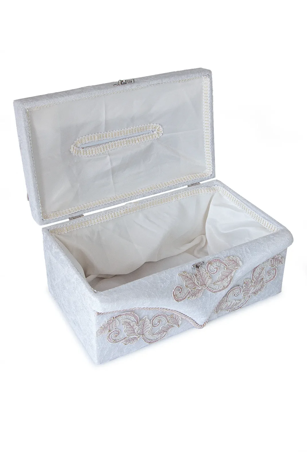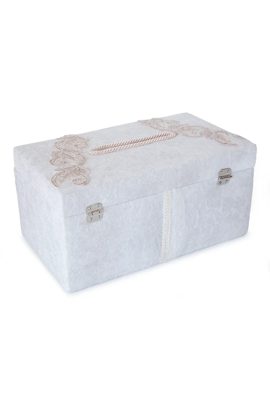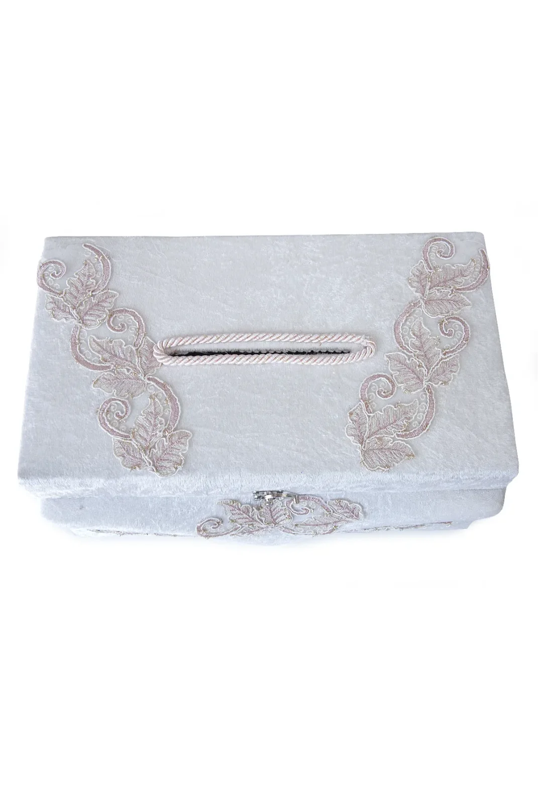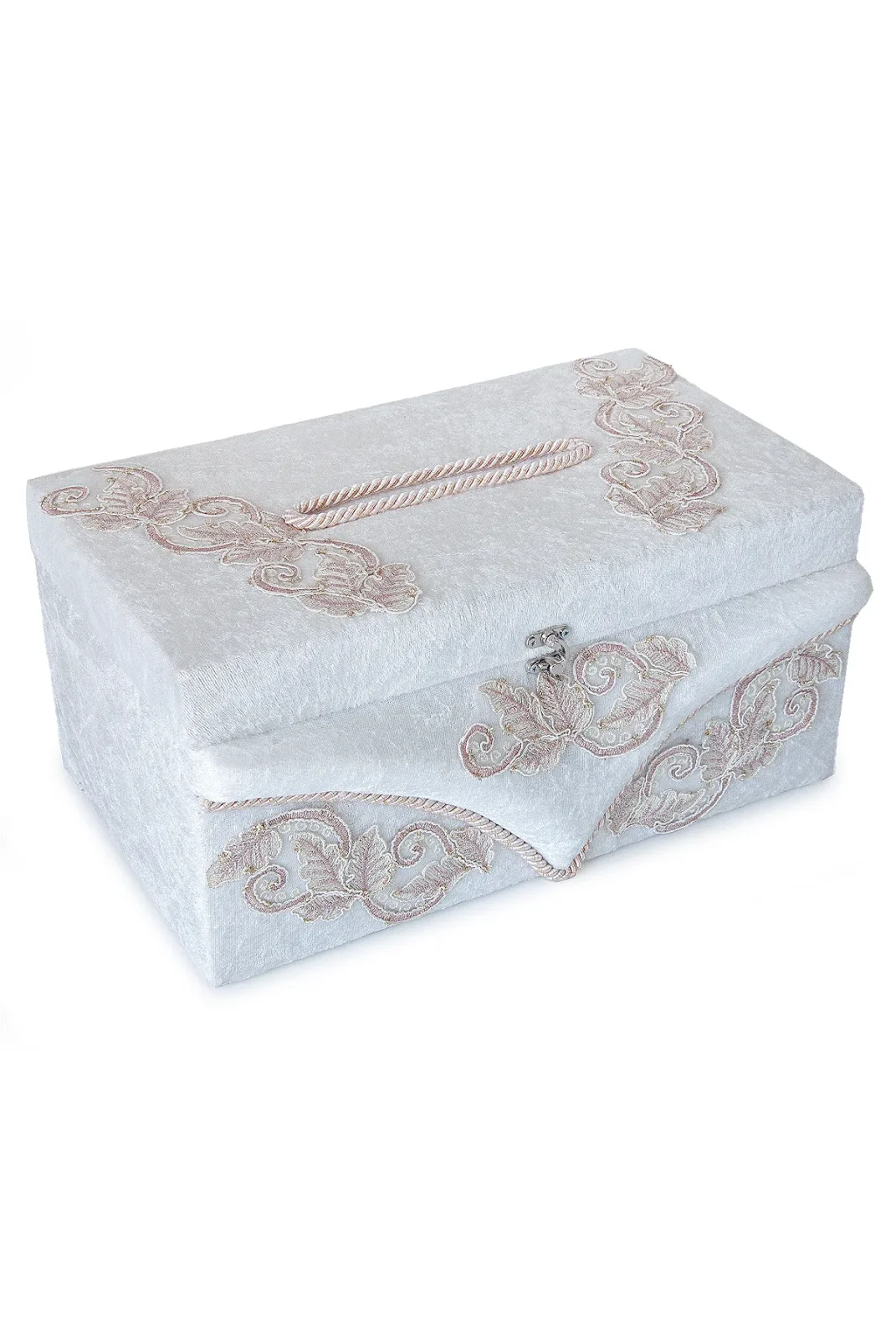 Yumuşak kadife kaplaması ve estetik pembe çiçek detaylarıyla dekoratif bir görünüme sahip olan sandık, hem takı hem de para zarfı saklamak için idealdir. Aynı zamanda söz veya nişan masalarında zarif bir aksesuar olarak da dikkat çeker.