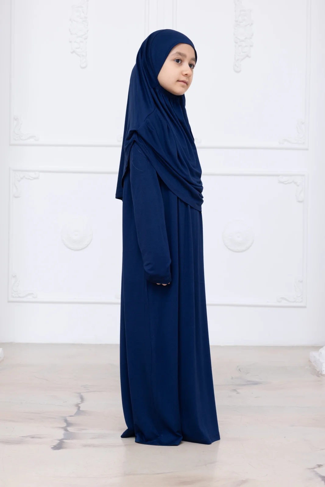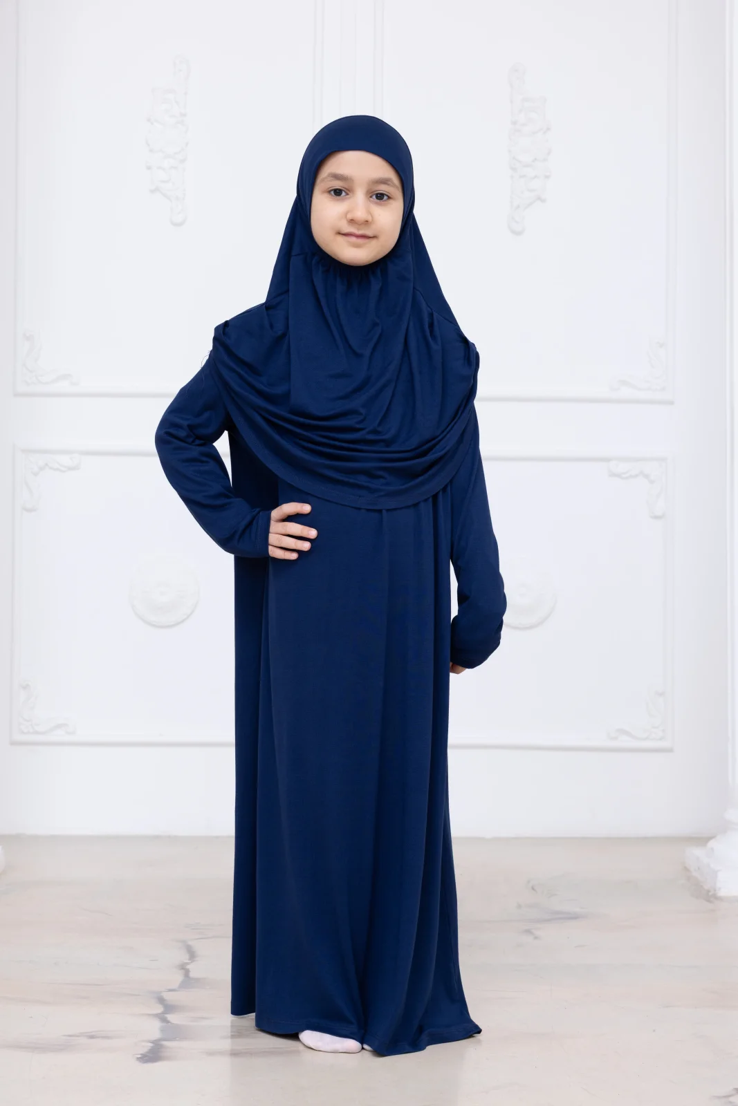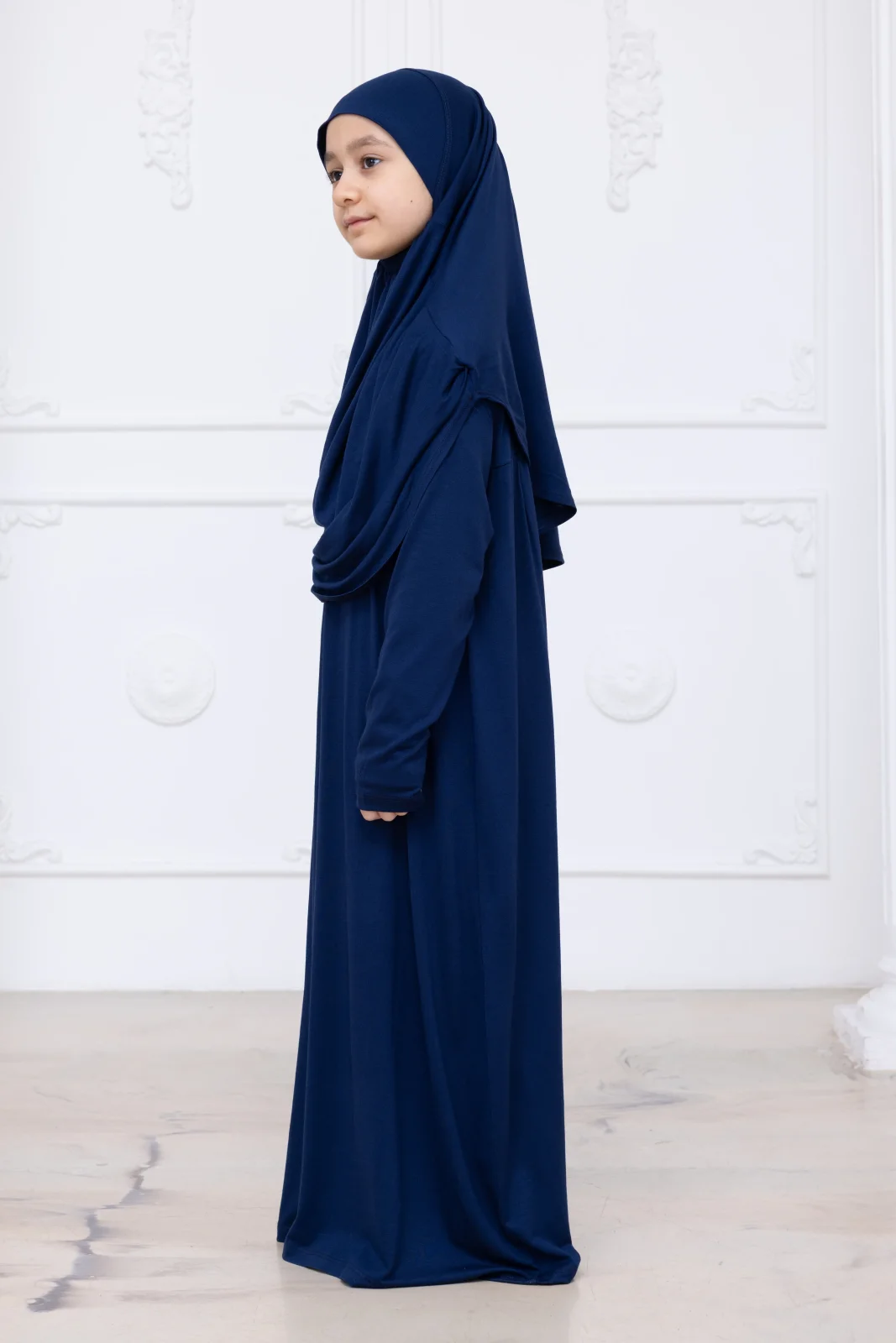 Pratik Başörtülü Çocuk Namaz Elbisesi, Tek Parça Çocuk Namaz Kıyafeti Lacivert