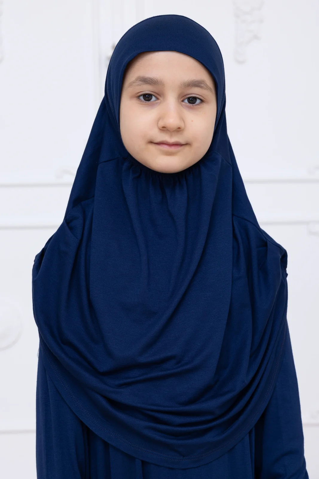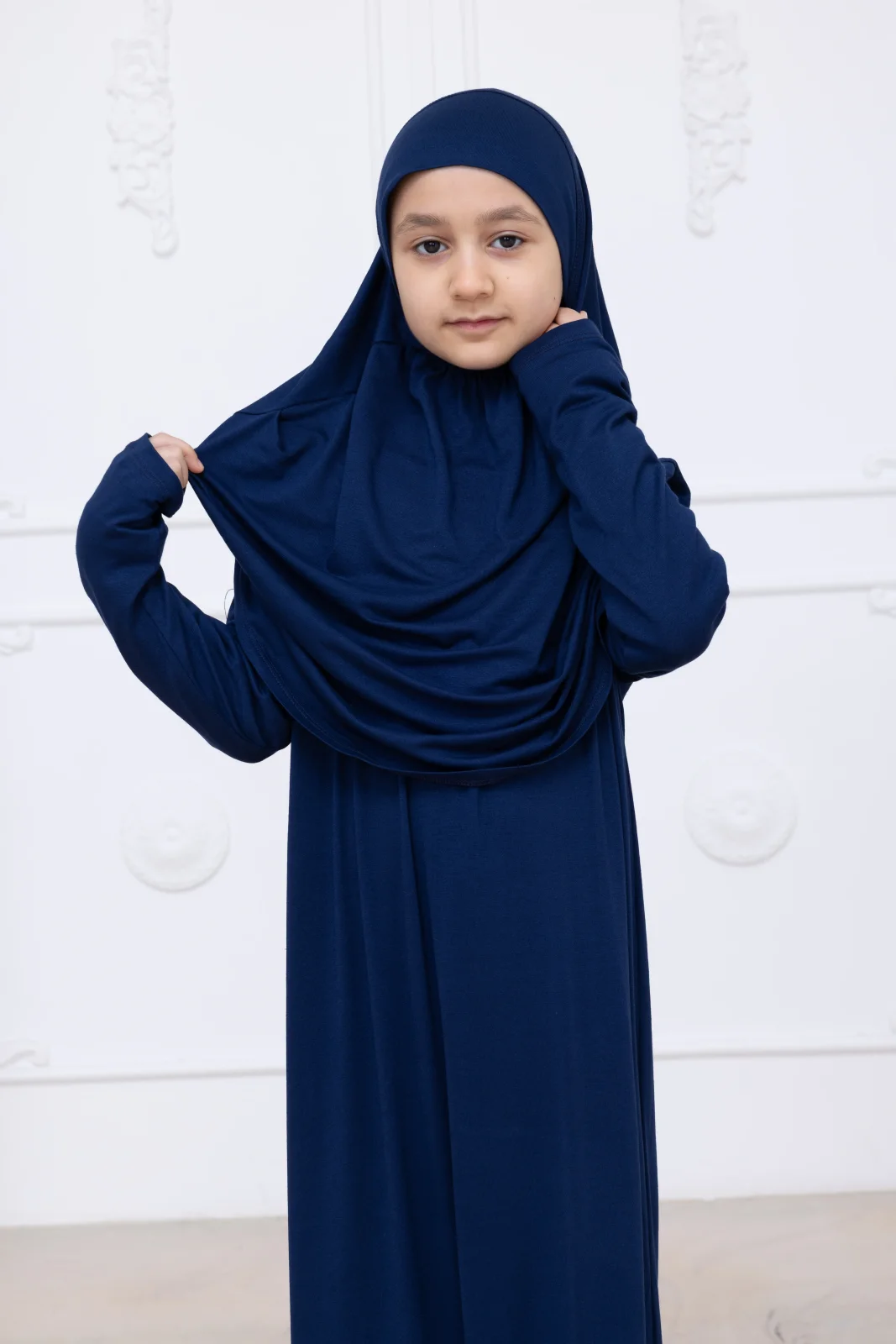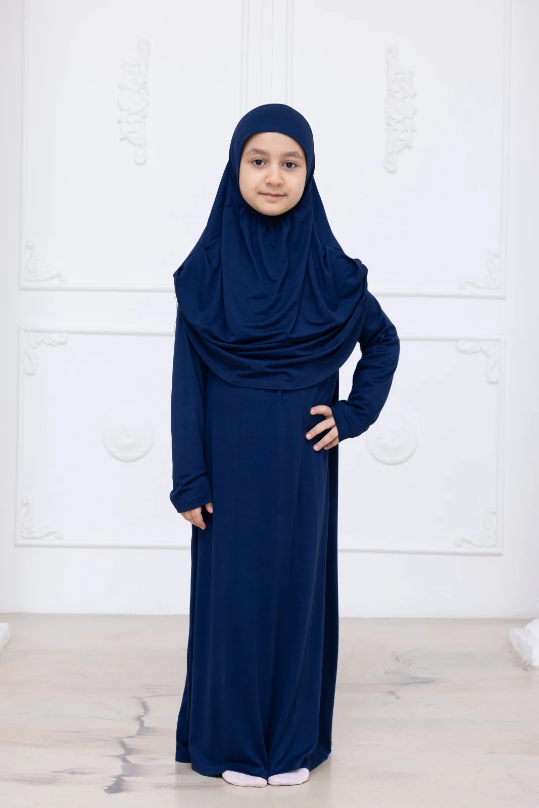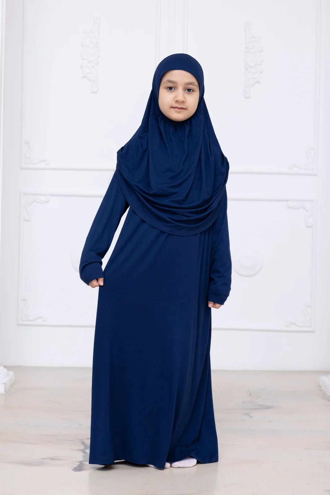 Pratik Başörtülü Çocuk Namaz Elbisesi, Tek Parça Çocuk Namaz Kıyafeti Lacivert
