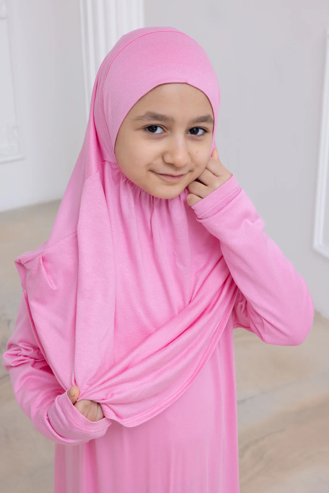 Pratik Başörtülü Çocuk Namaz Elbisesi, Tek Parça Çocuk Namaz Kıyafeti Pembe