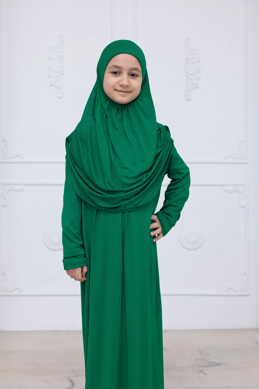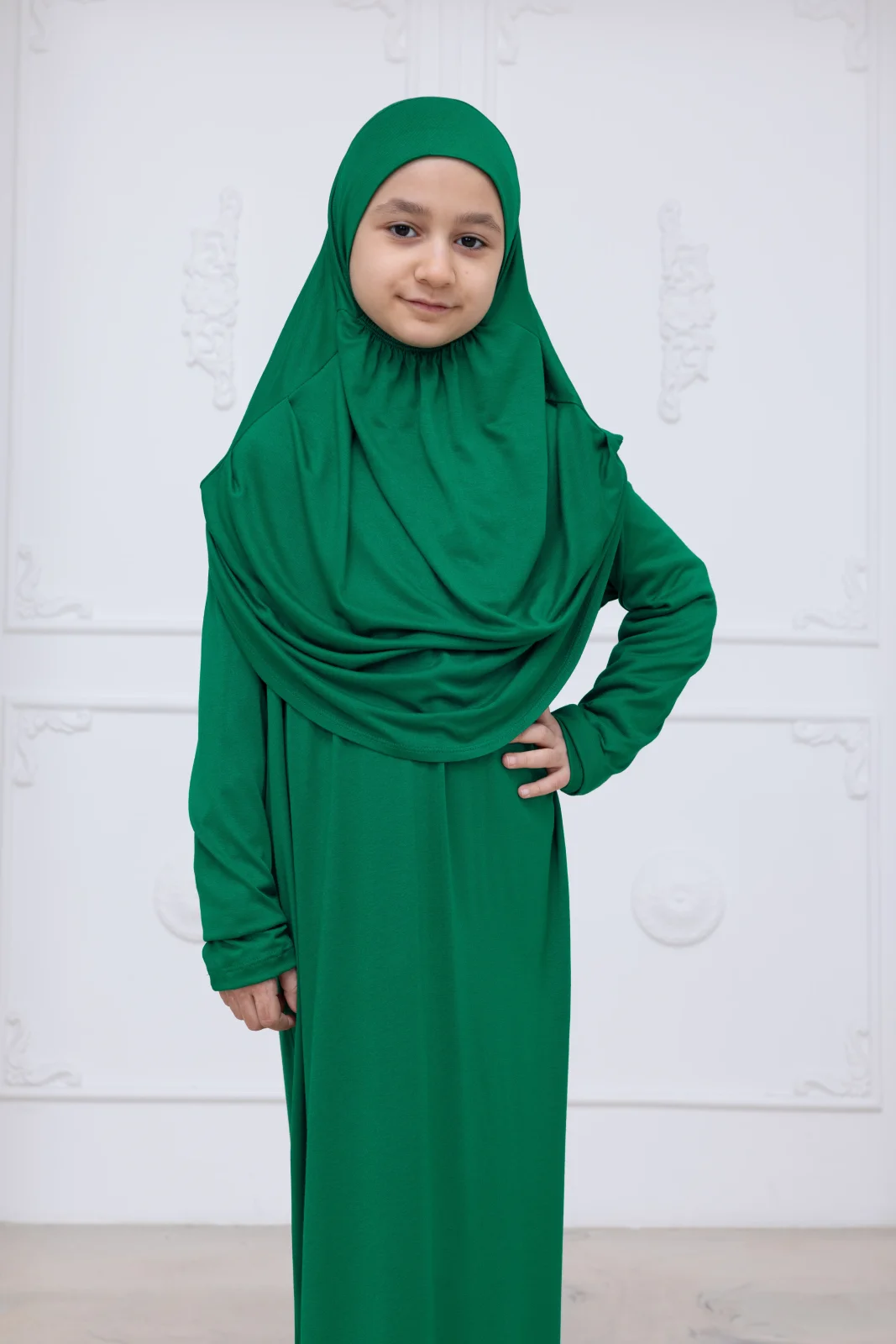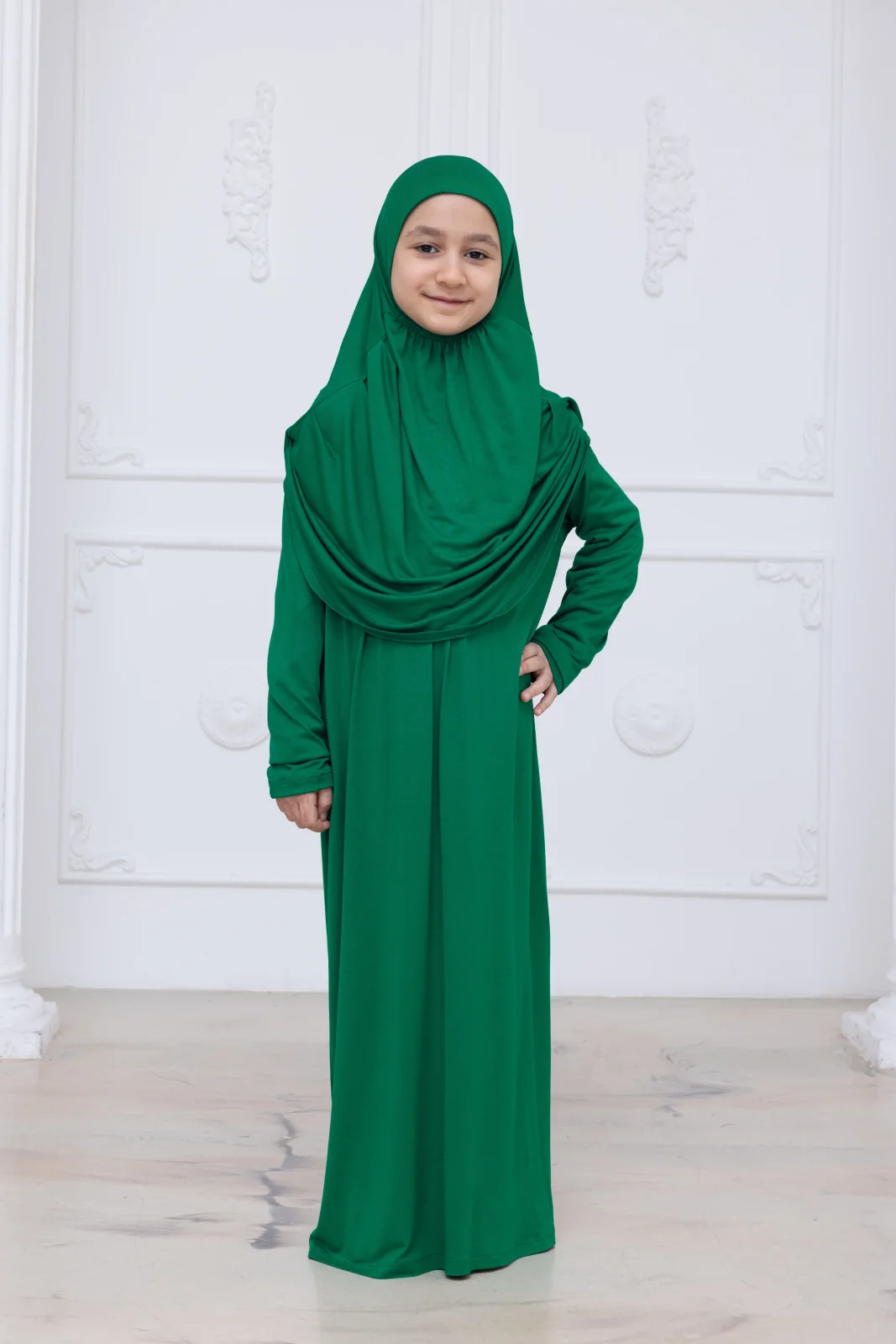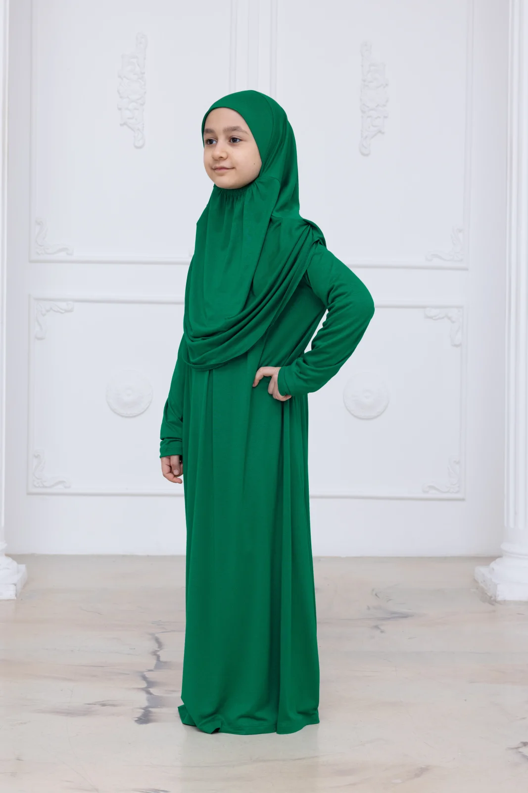 Pratik Başörtülü Çocuk Namaz Elbisesi, Tek Parça Çocuk Namaz Kıyafeti Yeşil