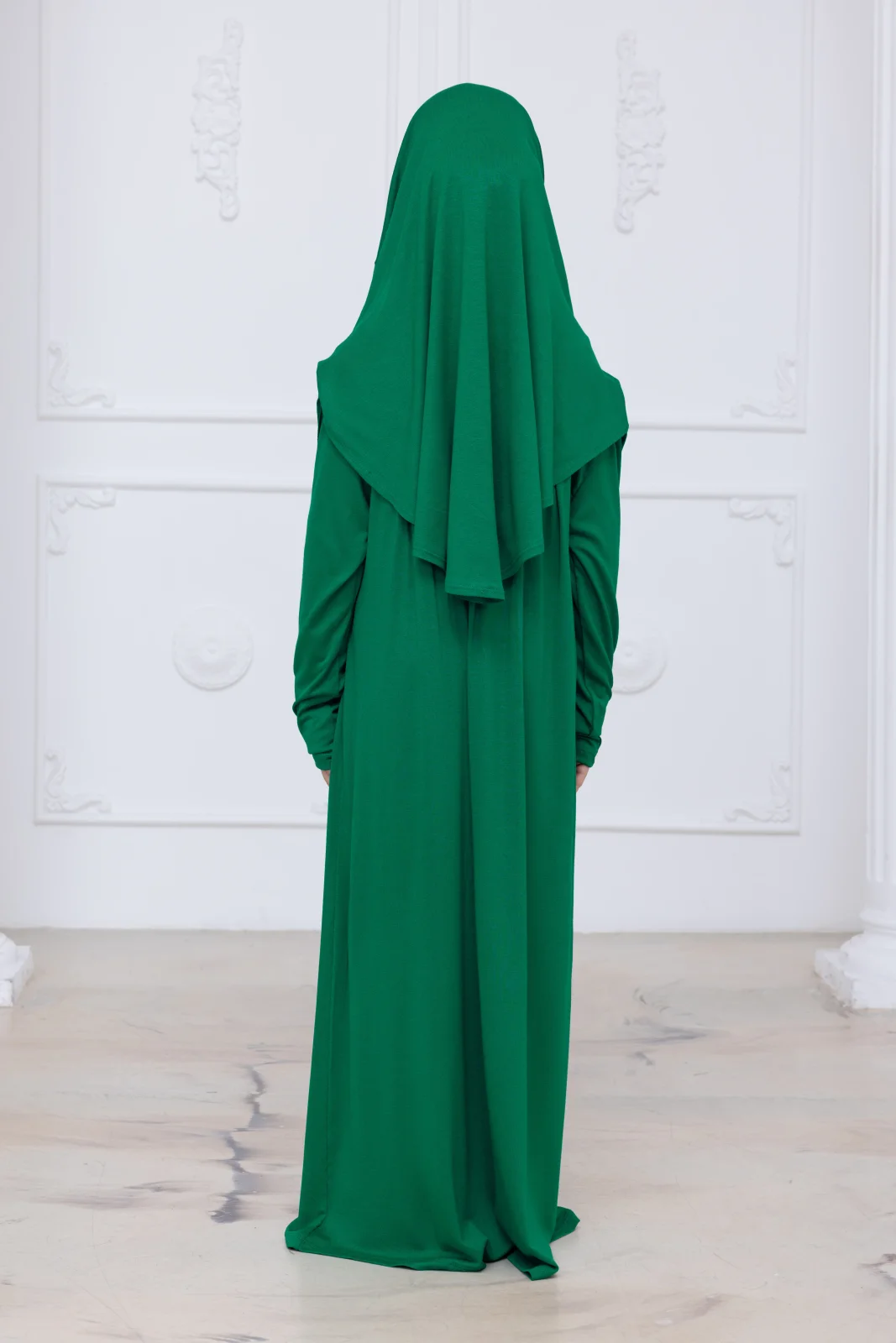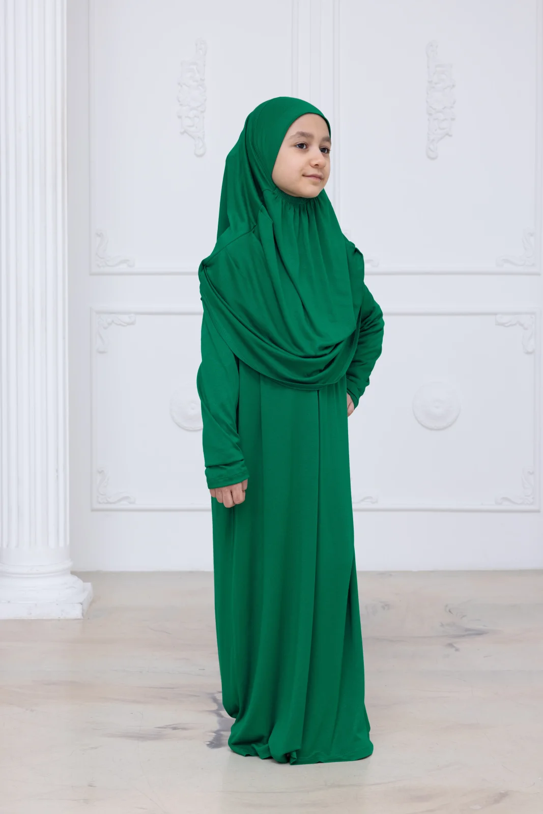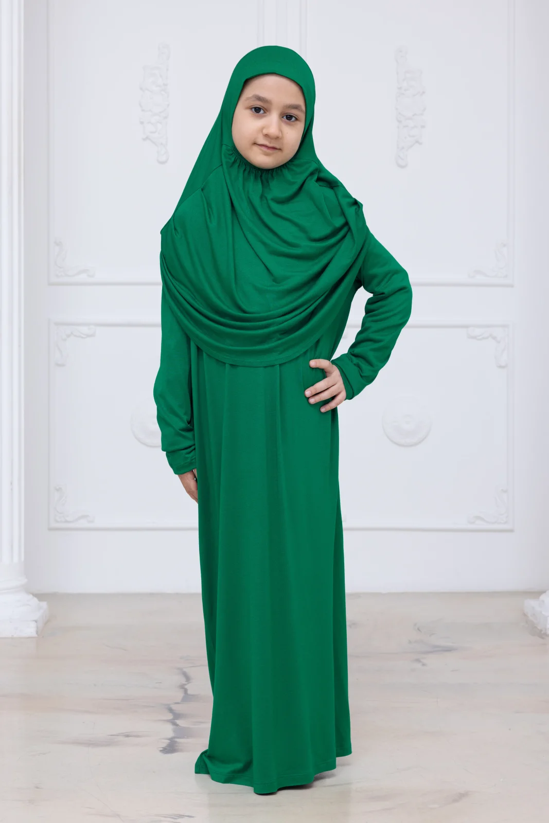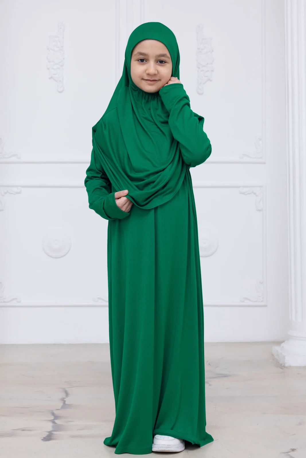 Pratik Başörtülü Çocuk Namaz Elbisesi, Tek Parça Çocuk Namaz Kıyafeti Yeşil