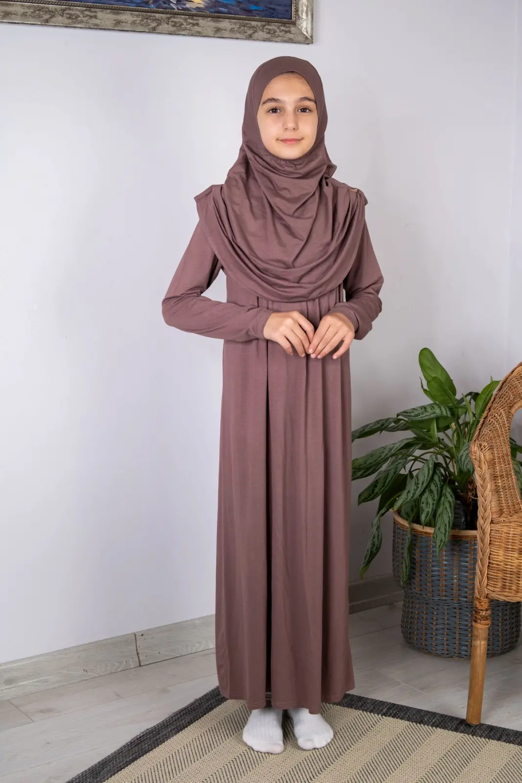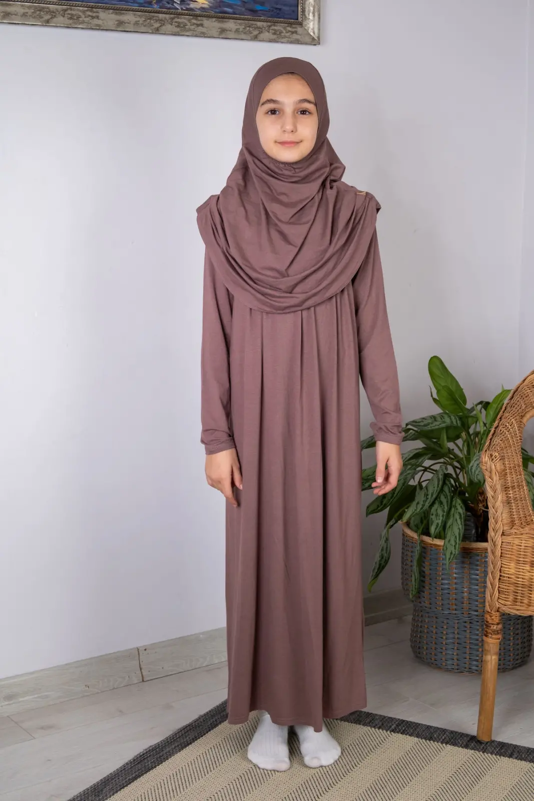 Kız çocukları için özel olarak tasarlanmış bu tek parça namaz elbisesi, sade ve zarif görünümüyle ibadetlerde konfor sunar. Entegre başörtüsü sayesinde kolayca giyilip çıkarılır, bağlama derdi yoktur. Likralı penye kumaşıyla esnek ve rahat bir kullanım sağlar, terletmez ve kırışmaz.