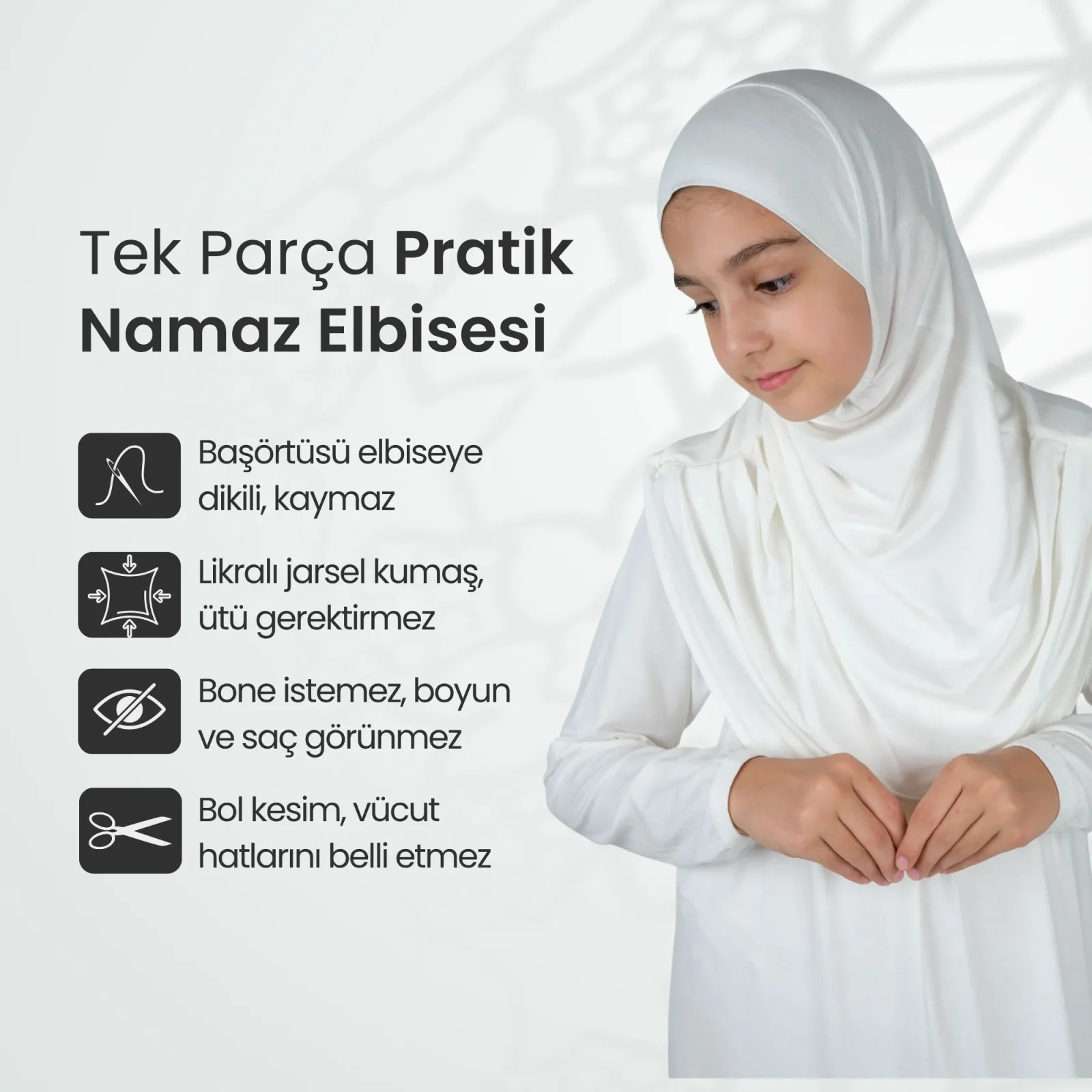 Kız çocukları için özel olarak tasarlanmış bu tek parça namaz elbisesi, sade ve zarif görünümüyle ibadetlerde konfor sunar. Entegre başörtüsü sayesinde kolayca giyilip çıkarılır, bağlama derdi yoktur. Likralı penye kumaşıyla esnek ve rahat bir kullanım sağlar, terletmez ve kırışmaz.