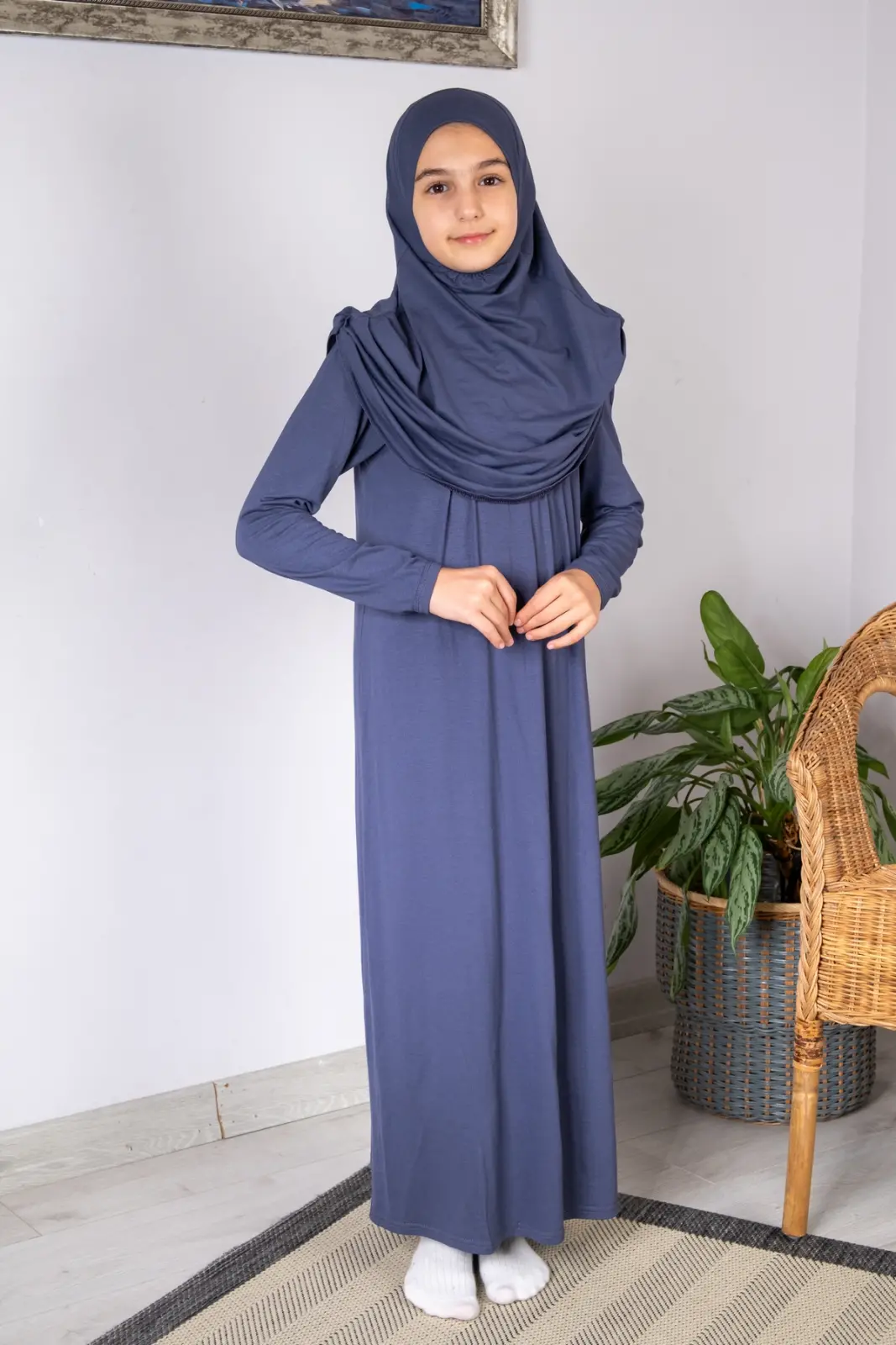 Pratik Başörtülü Tek Parça Çocuk Namaz Elbisesi 8-12 Yaş - Lacivert