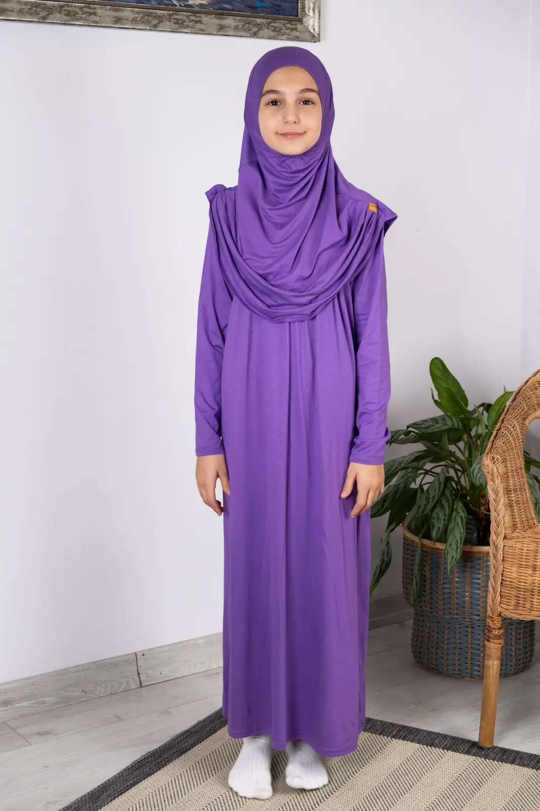 Pratik Başörtülü Tek Parça Çocuk Namaz Elbisesi 8-12 Yaş - Mor