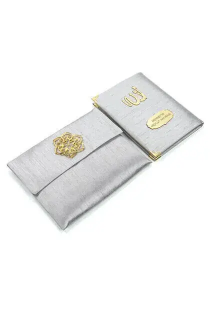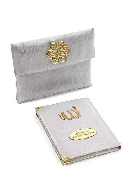Şantuk Kumaş Kaplı Yasin Kitabı - Çanta Boy - İsme Özel Plakalı - Keseli - Gri Renk - Mevlid Hediyeliği