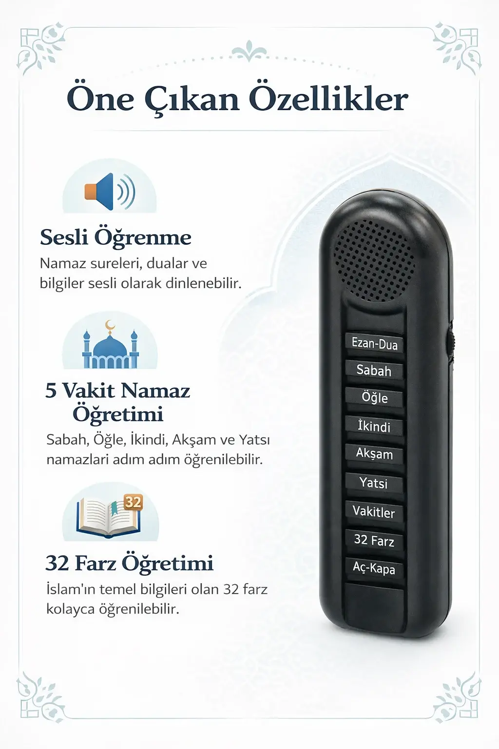 Sesli 5 Vakit Namaz Öğreten ve Kıldıran Cihaz, namazı öğrenmek isteyen çocuklar, yeni başlayanlar ve bilgilerini tekrar etmek isteyen kullanıcılar için pratik bir yardımcıdır. Üzerindeki sesli yönlendirme sistemi sayesinde namaz bölümleri kolayca dinlenebilir, temel dini bilgiler daha anlaşılır şekilde takip edilebilir.