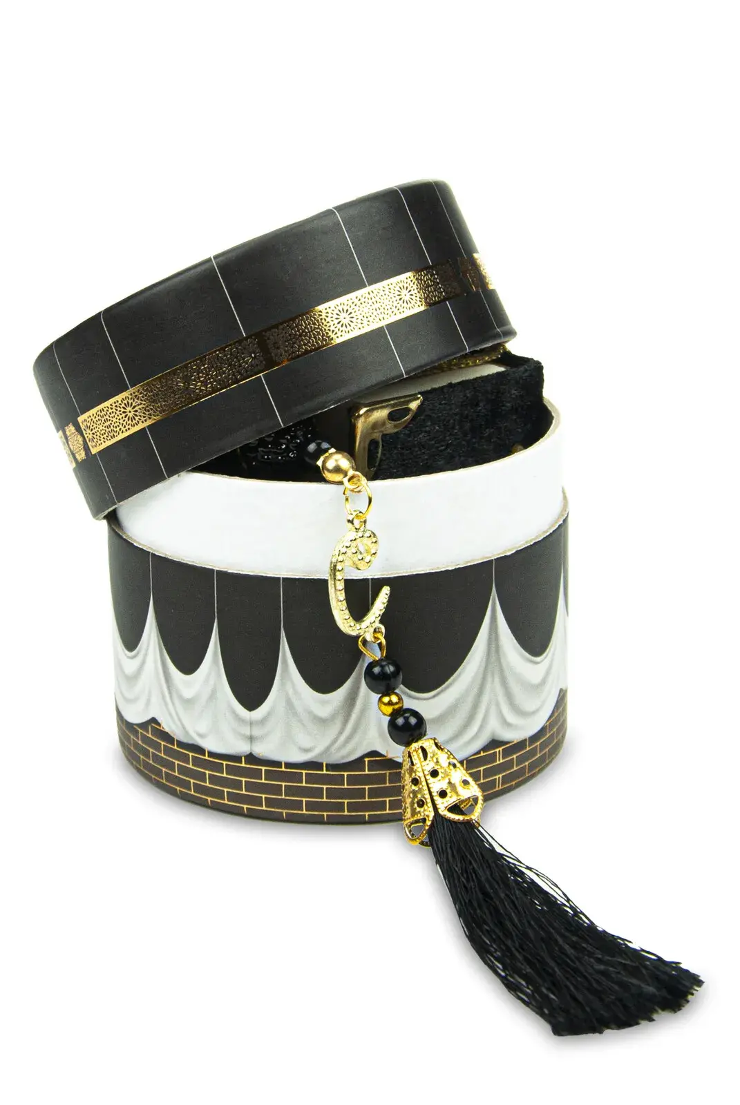 Silindir Kabe Mini Kadife Kaplı Kuranlı Siyah İnci Tesbih Seti