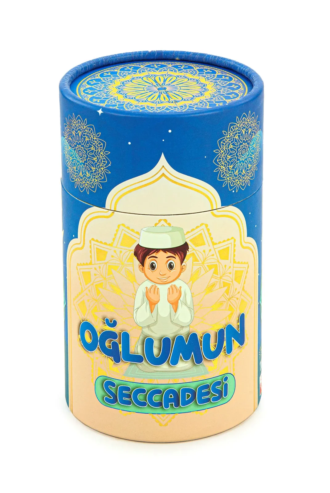 Silindir Kutulu Tesbihli Dijital Baskılı Çocuk Seccadesi Seti Mavi