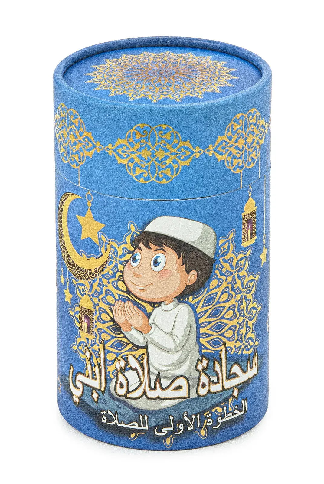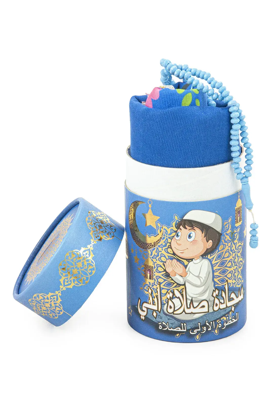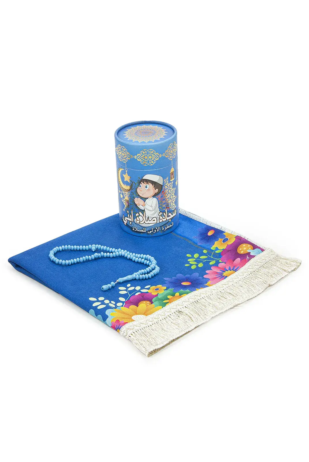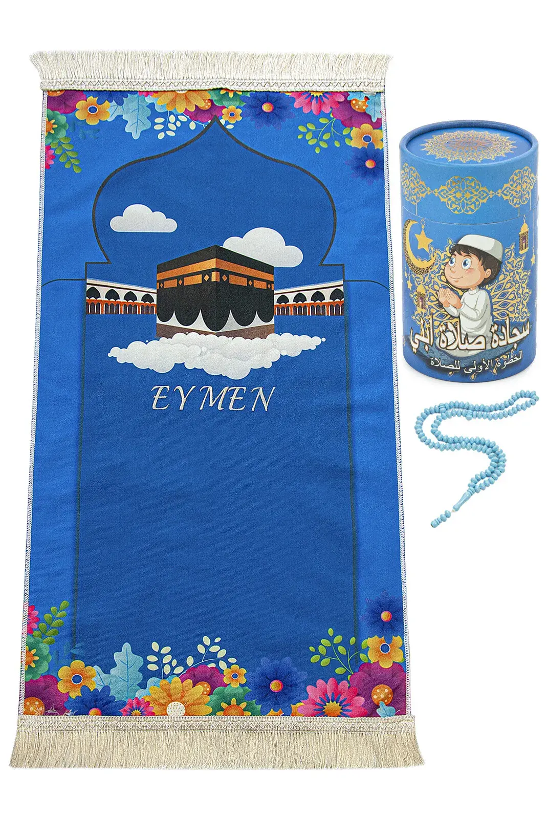 Silindir Kutulu Tesbihli İsme Özel Nakış İşlemeli Çocuk Seccade Seti Mavi