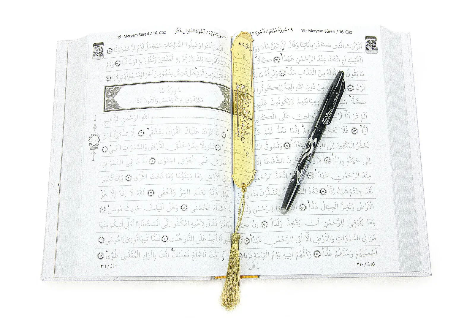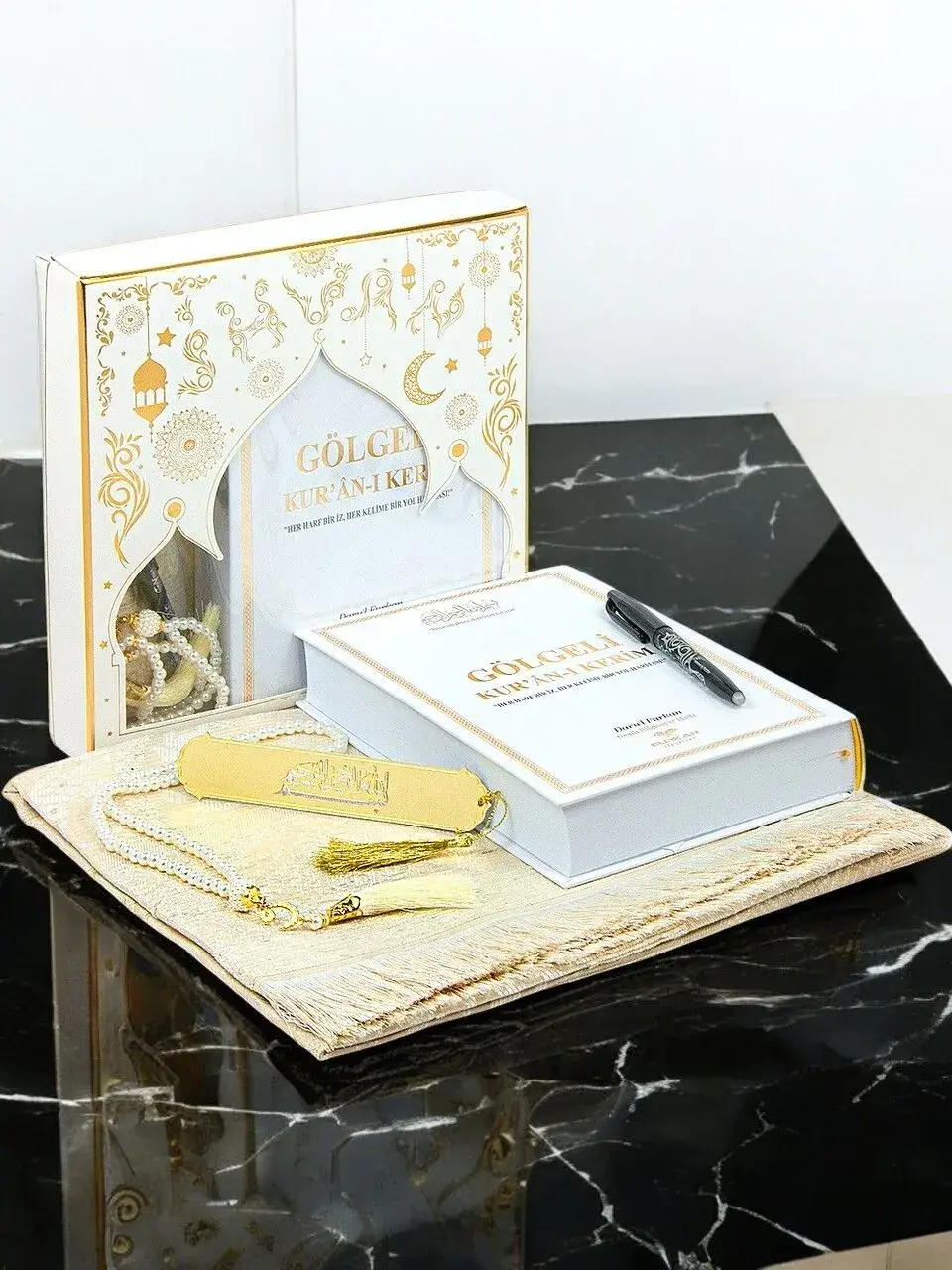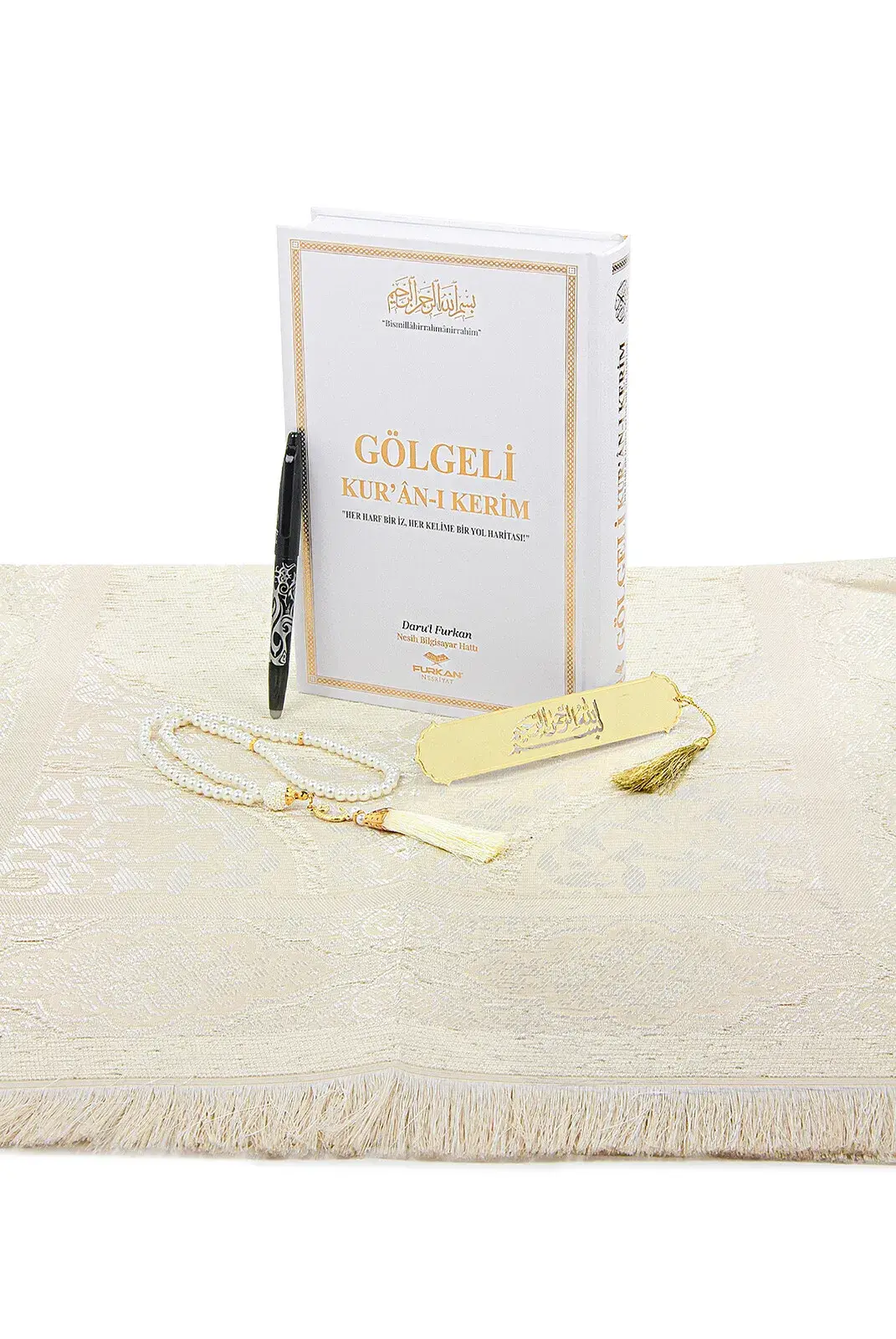 Silinebilir Kalemli Gölgeli Kuranı Kerim Seti Tesbihli Seccade Seti Beyaz