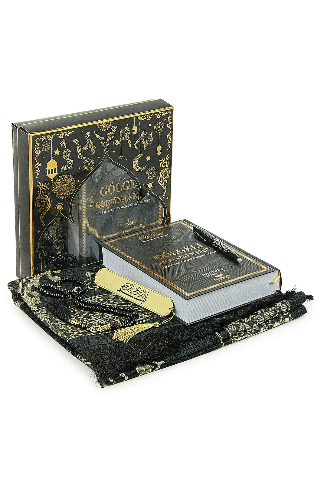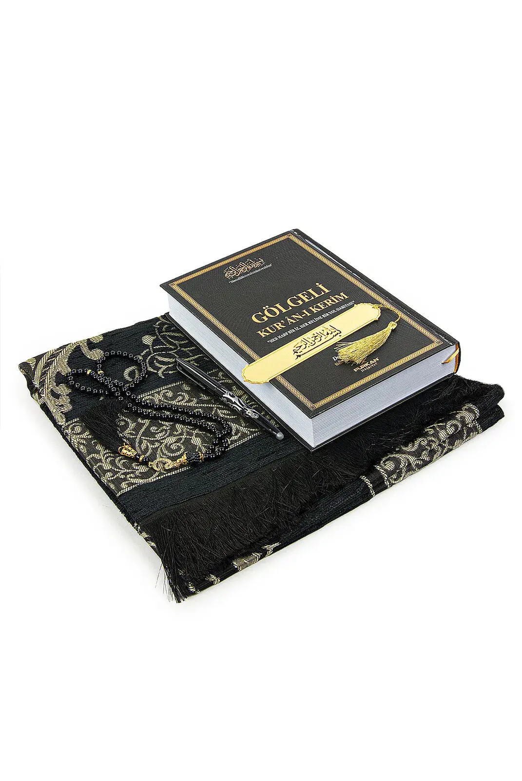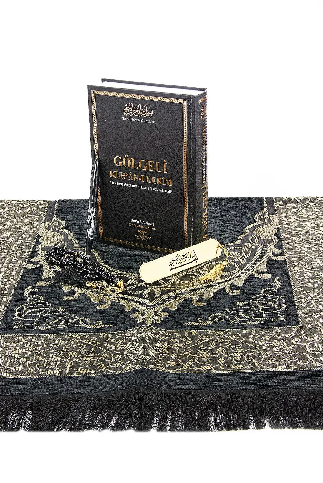 Silinebilir Kalemli Gölgeli Kuranı Kerim Seti Tesbihli Seccade Seti Siyah