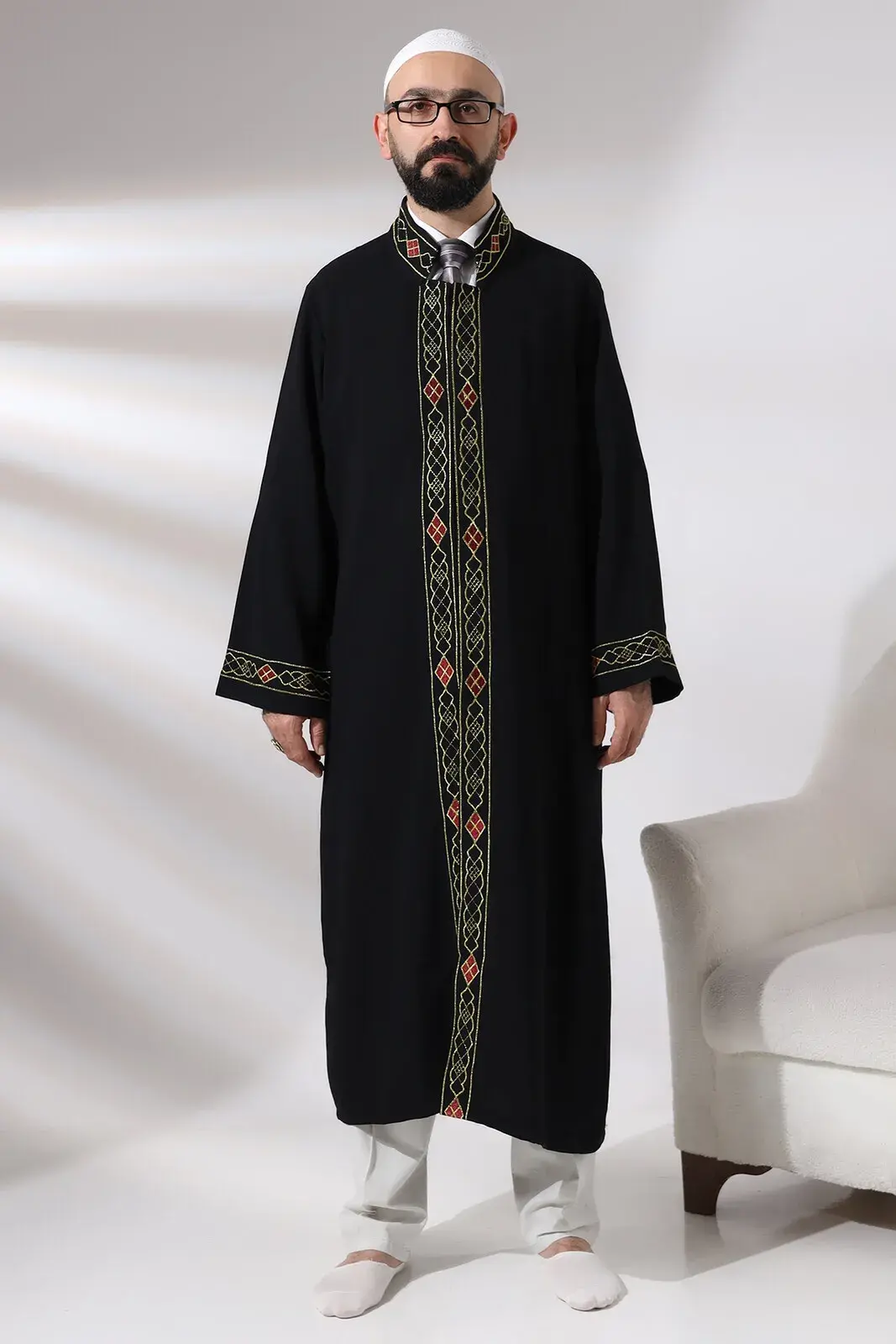 Geleneksel ve sade bir zarafetin birleşimi olan bu İmam Cübbesi, Alpaka pamuklu kumaşı sayesinde ibadet sırasında rahatlık sağlarken, önden kapatmalı gizli çıtçıtlı tasarımı kullanımı kolaylaştırır. Hakim yaka detayı, cübbeye geleneksel bir hava katarak sade bir şıklık sunarken, baklava benzeri nakış işlemeler estetik bir dokunuş ekler. Bu cübbe, ibadetlerde imamların ihtiyaçlarına uygun pratik ve zarif bir seçenek sunar. Geleneksel ve işlevsel tasarımı, imamların görevlerini yerine getirirken rahatlık ve şıklığı bir araya getirir.
