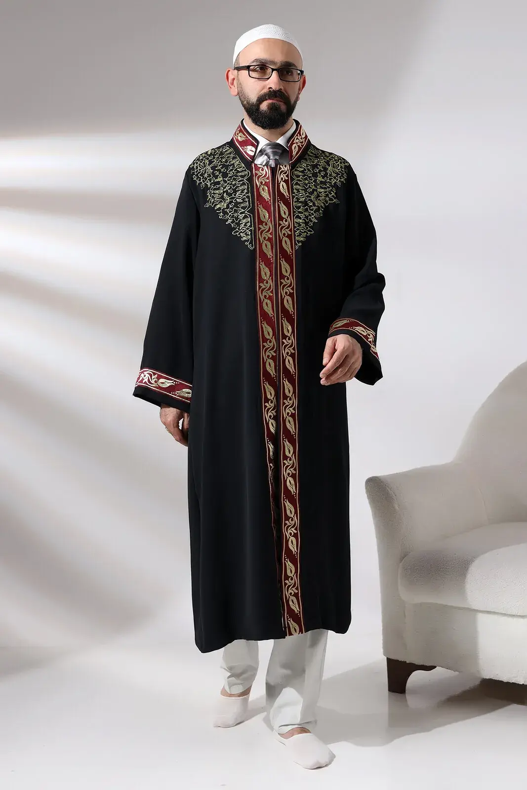 Siyah Hakim Yaka Erkek Namaz Elbisesi Şerit Nakış İşlemeli İmam Cübbesi