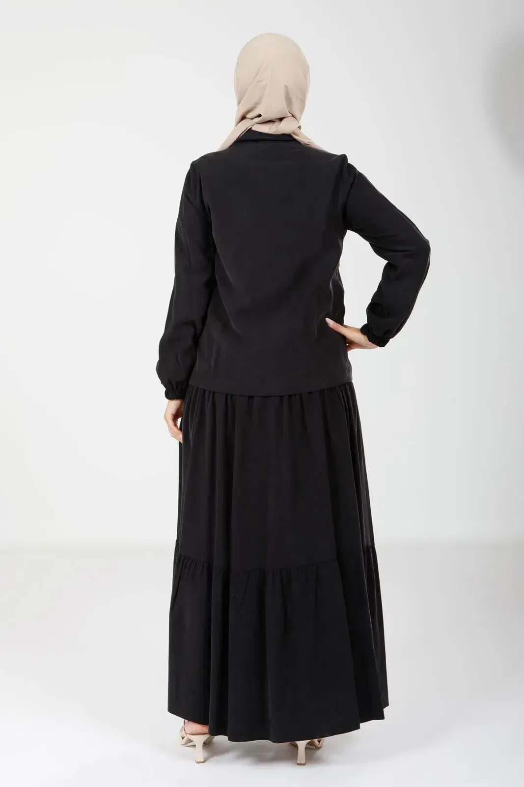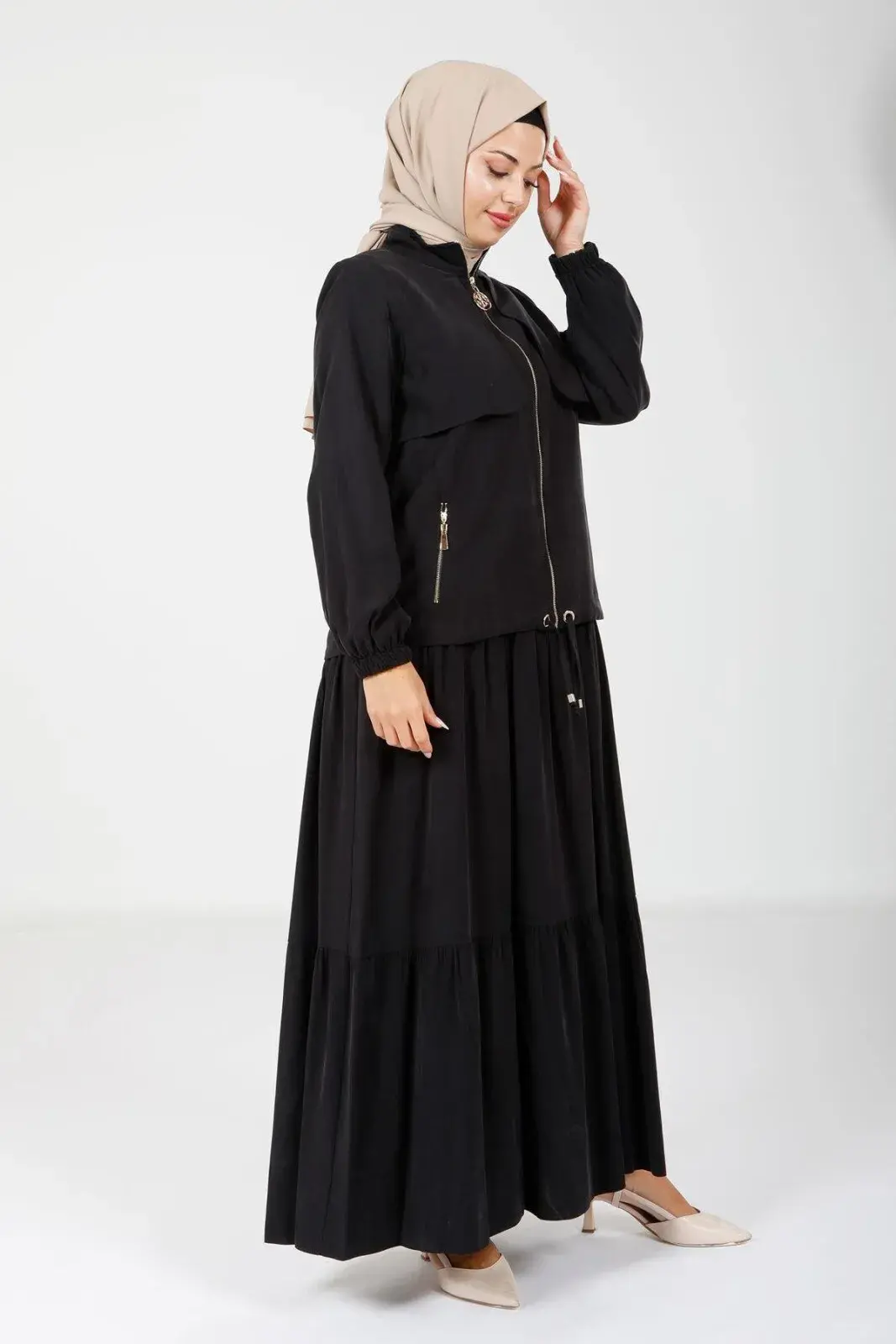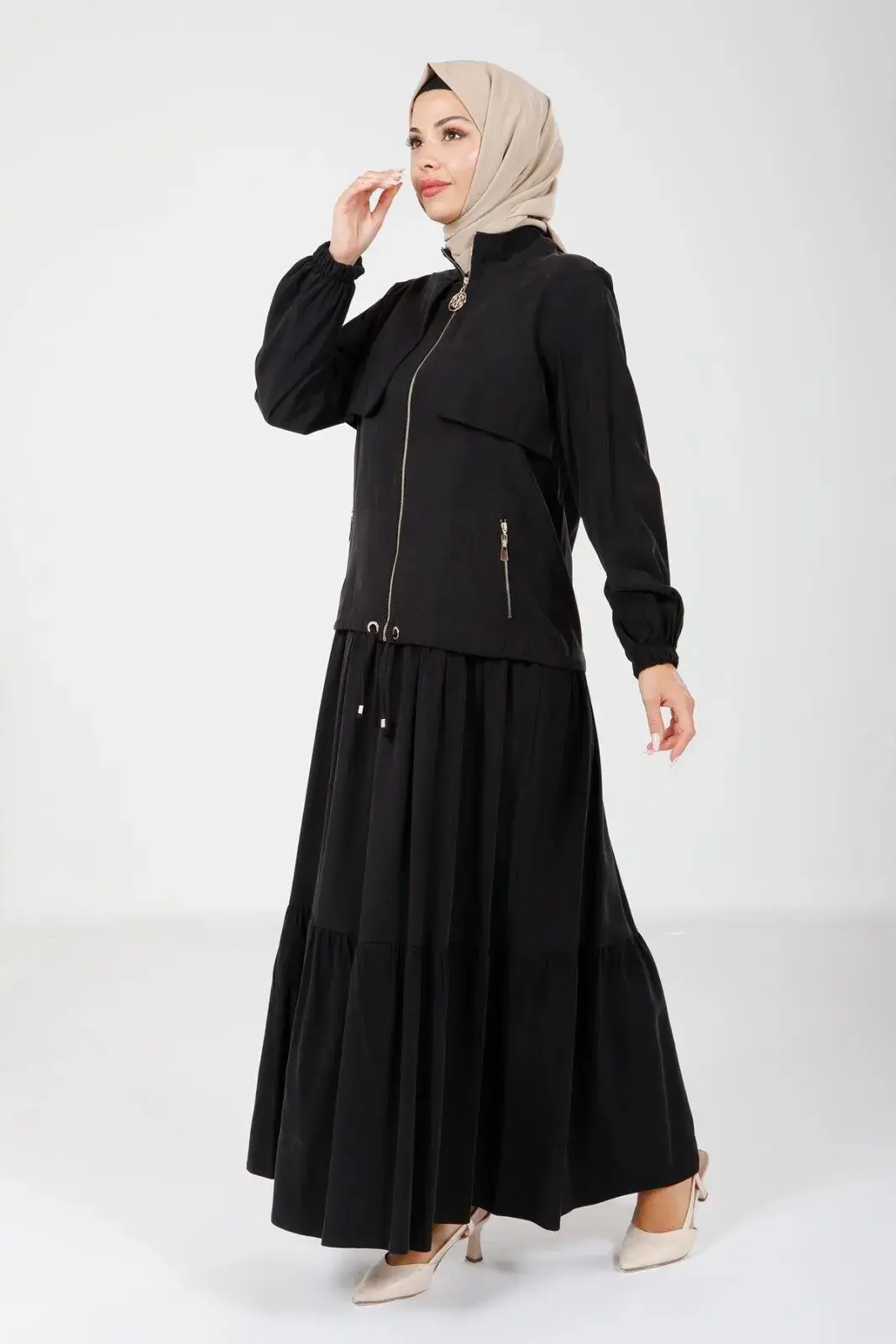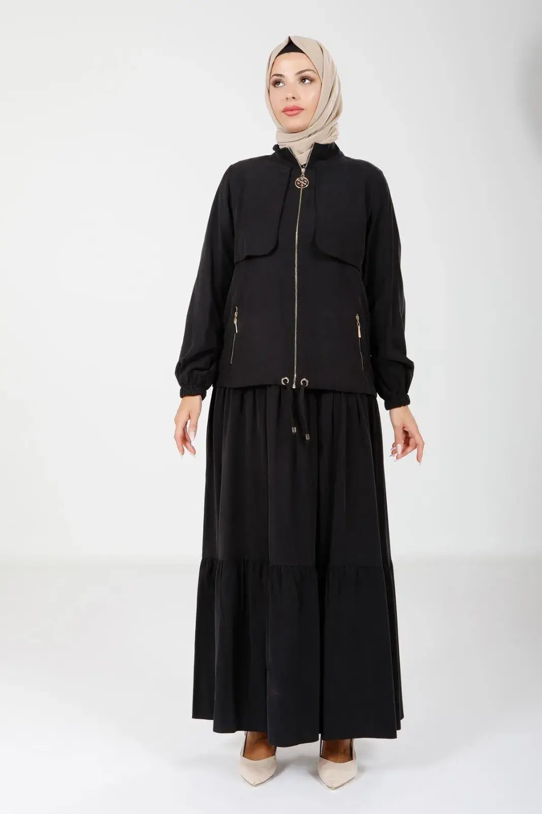 Günlük kombinlerde tercih edilen ceketli tesettür elbise modelleri arasında öne çıkar.