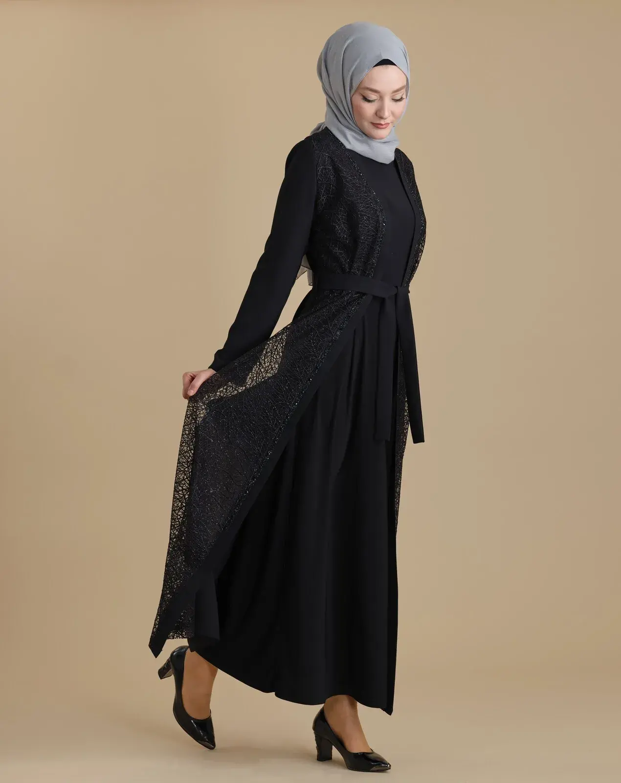 İkili ferace abaya modelimiz iç elbisesi kısa kollu sendi kumaş olup dış kısmının arkası petek kumaş, ön kısmı tül üstüne işlenmiş kristal taşlı desenli transparan tül modeldir. Kemerli olan abaya ferace modelimiz özel günlerinizin kurtarıcısı olacak.