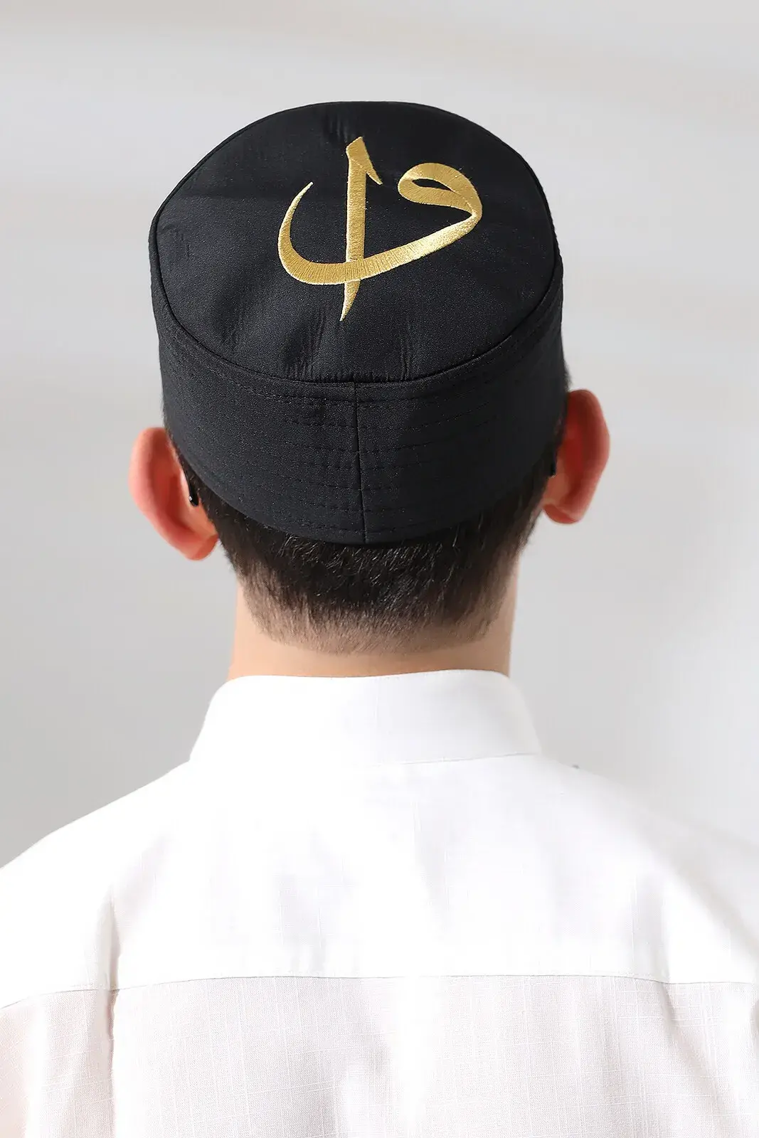 Siyah Kapitone Elif Vav Nakışlı Kalıp Namaz Takkesi