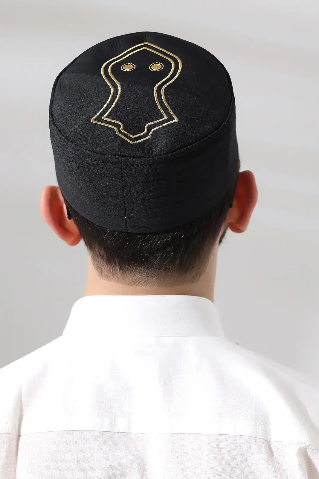 Siyah Kapitone Nalı Şerif Nakışlı Kalıp Namaz Takkesi