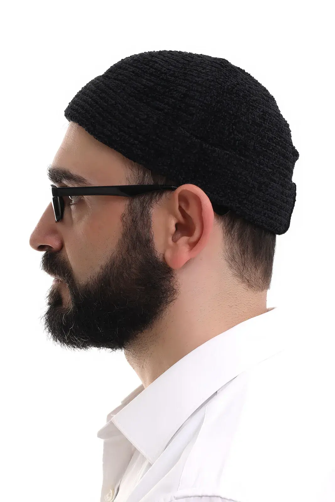 Siyah Katlamalı Sade Desen Kışlık Kadife Takke Şapka