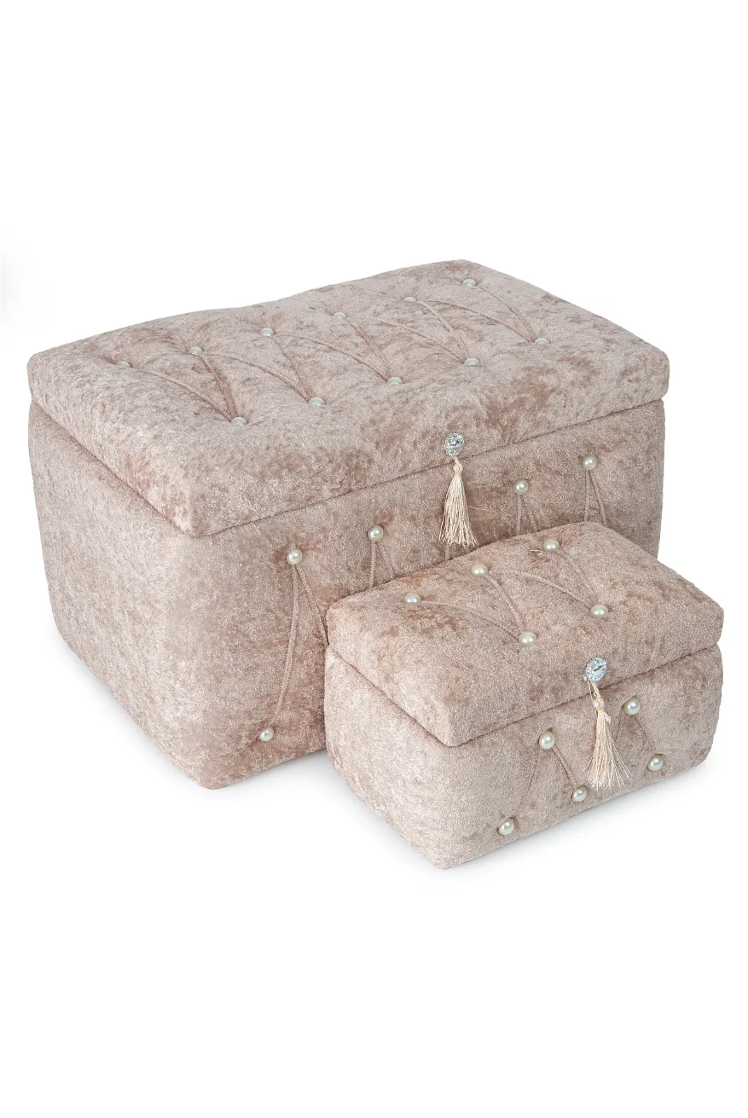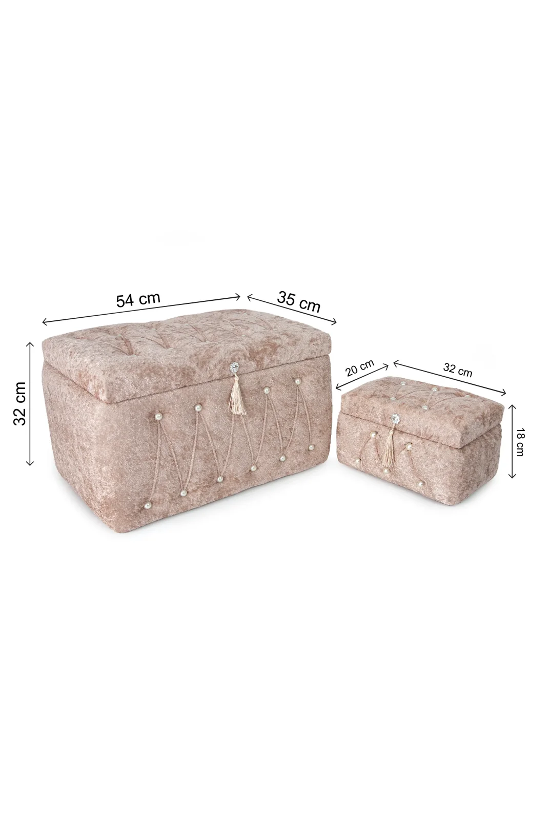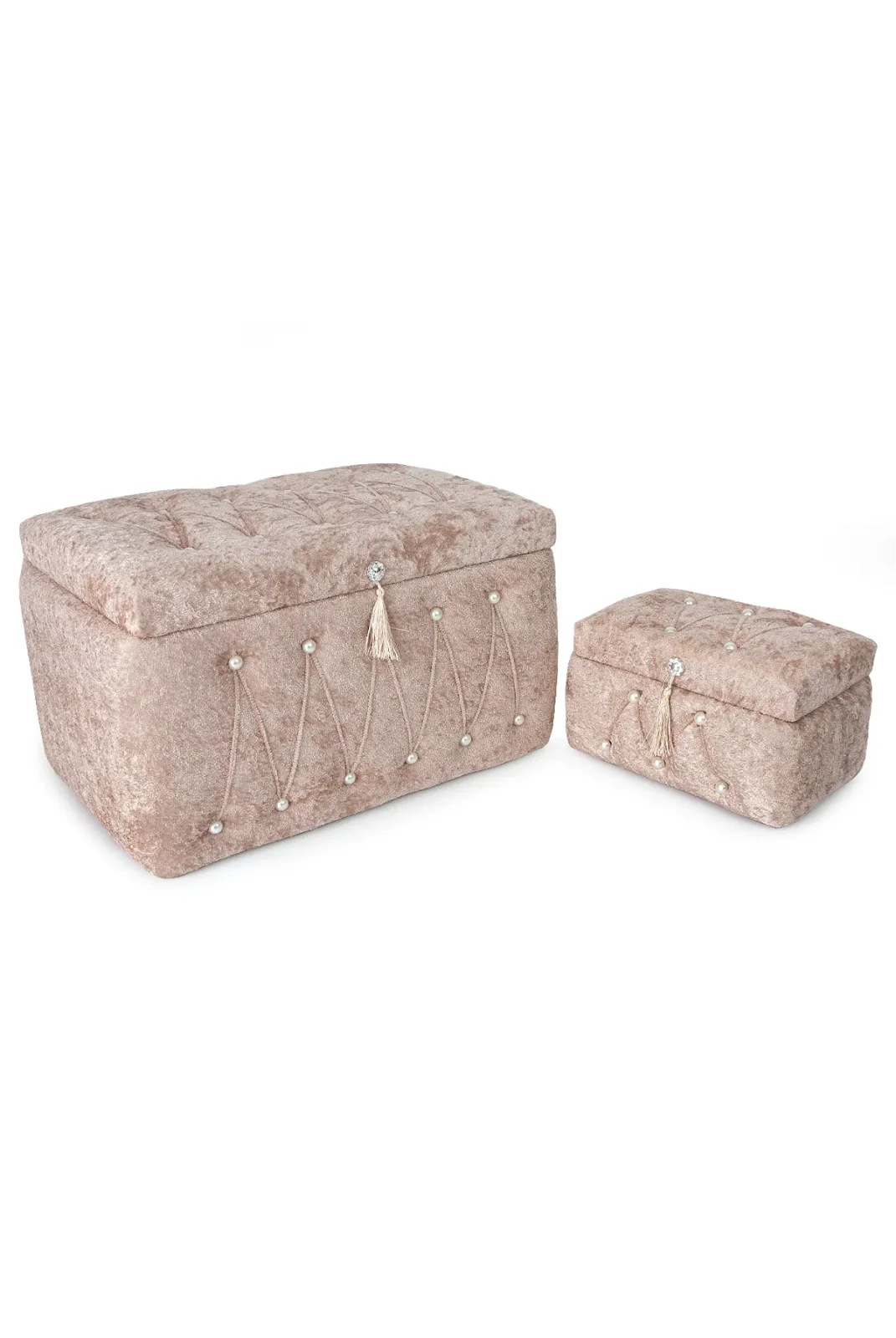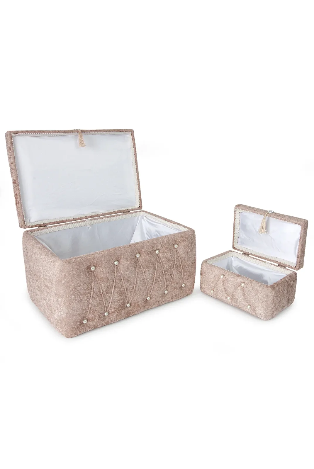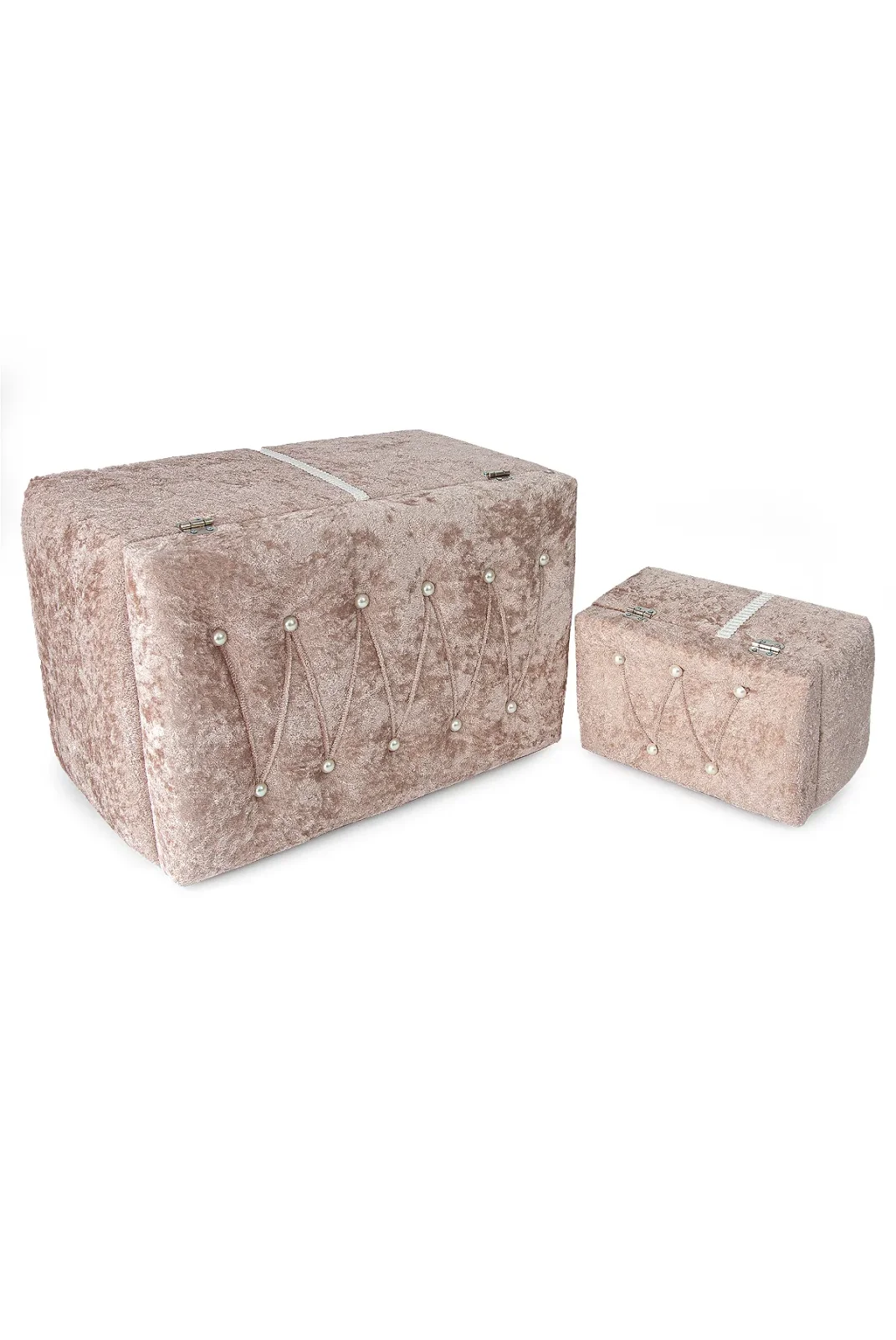 Sıcak kremit rengiyle dikkat çeken kadife ikili gelin sandık seti, özel günlerinizin atmosferine sofistike bir dokunuş katar.