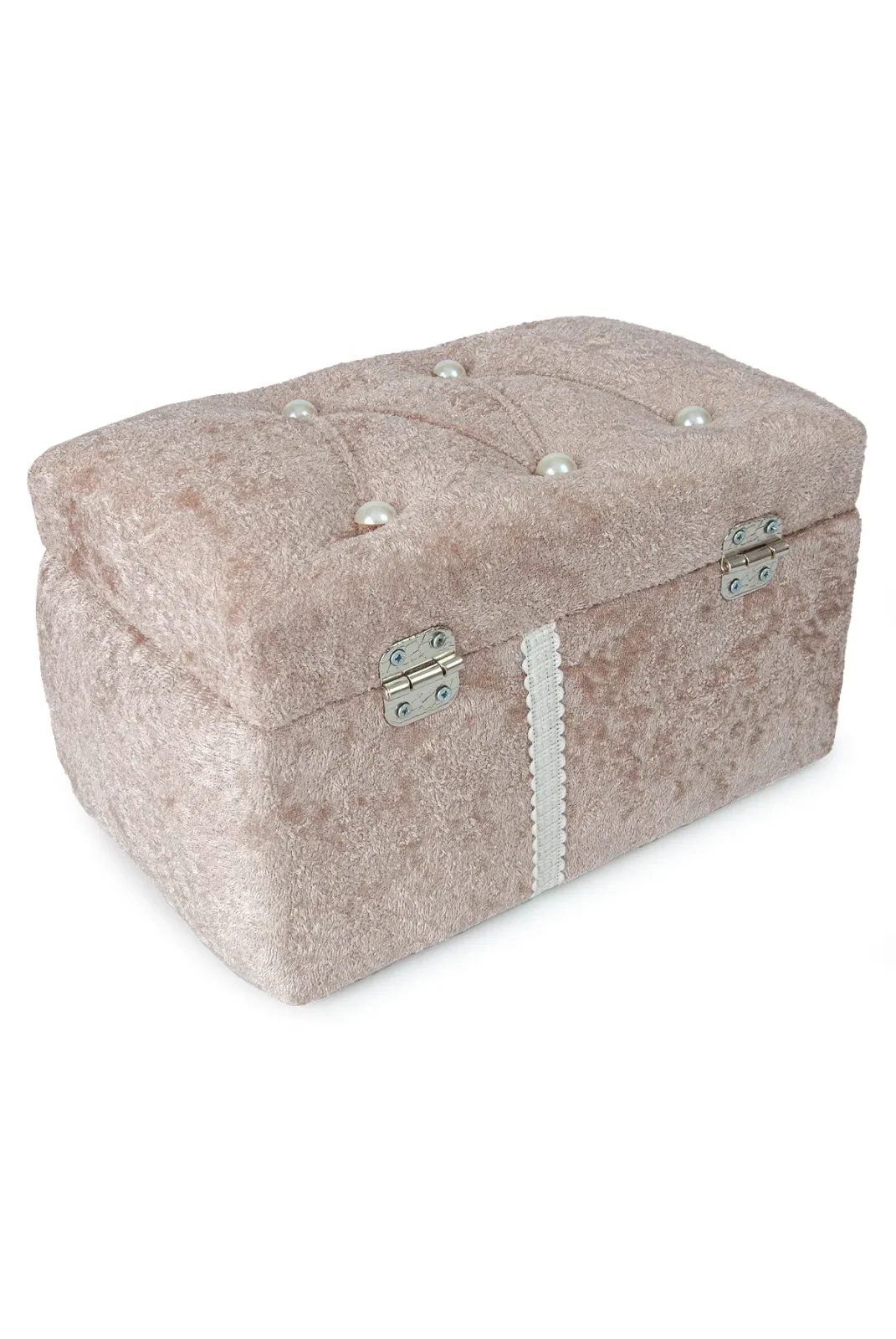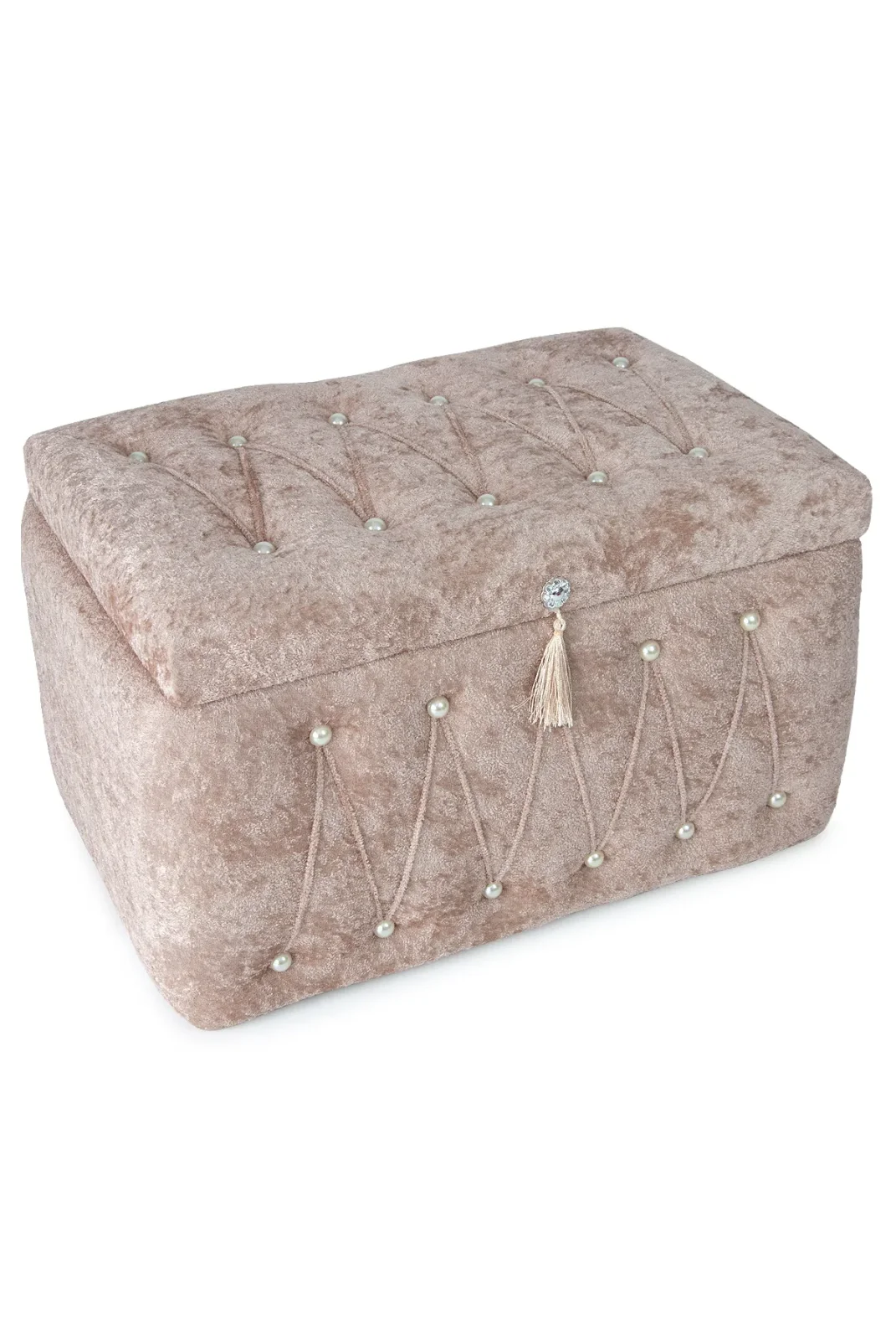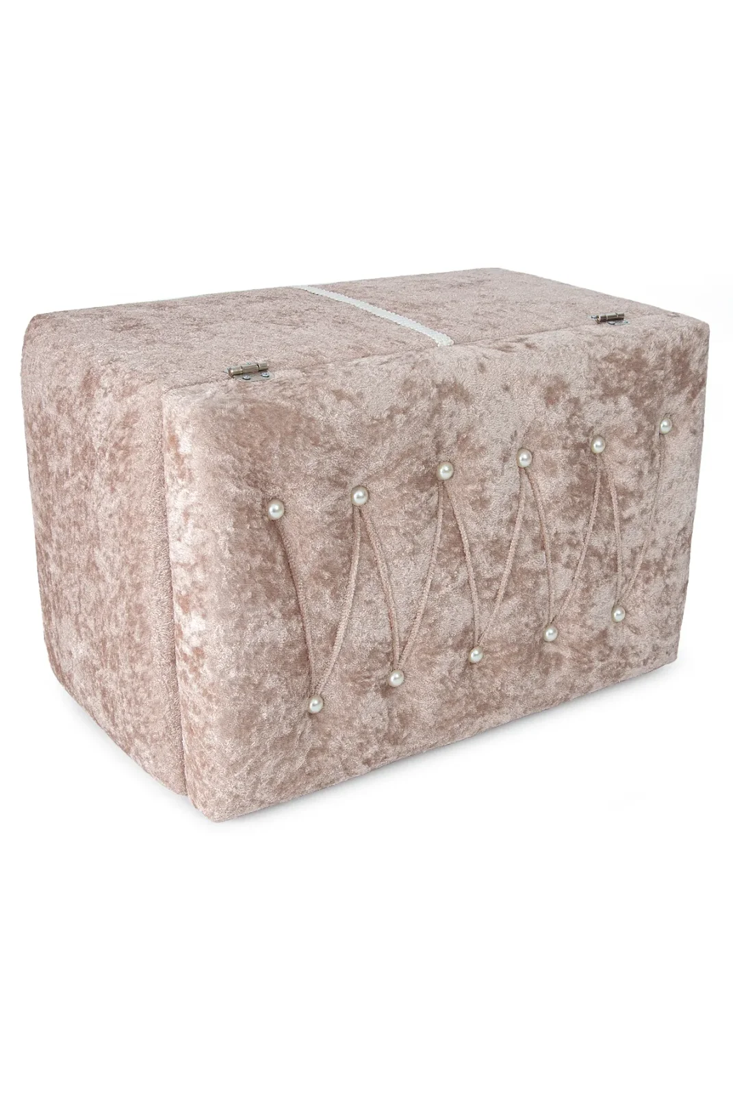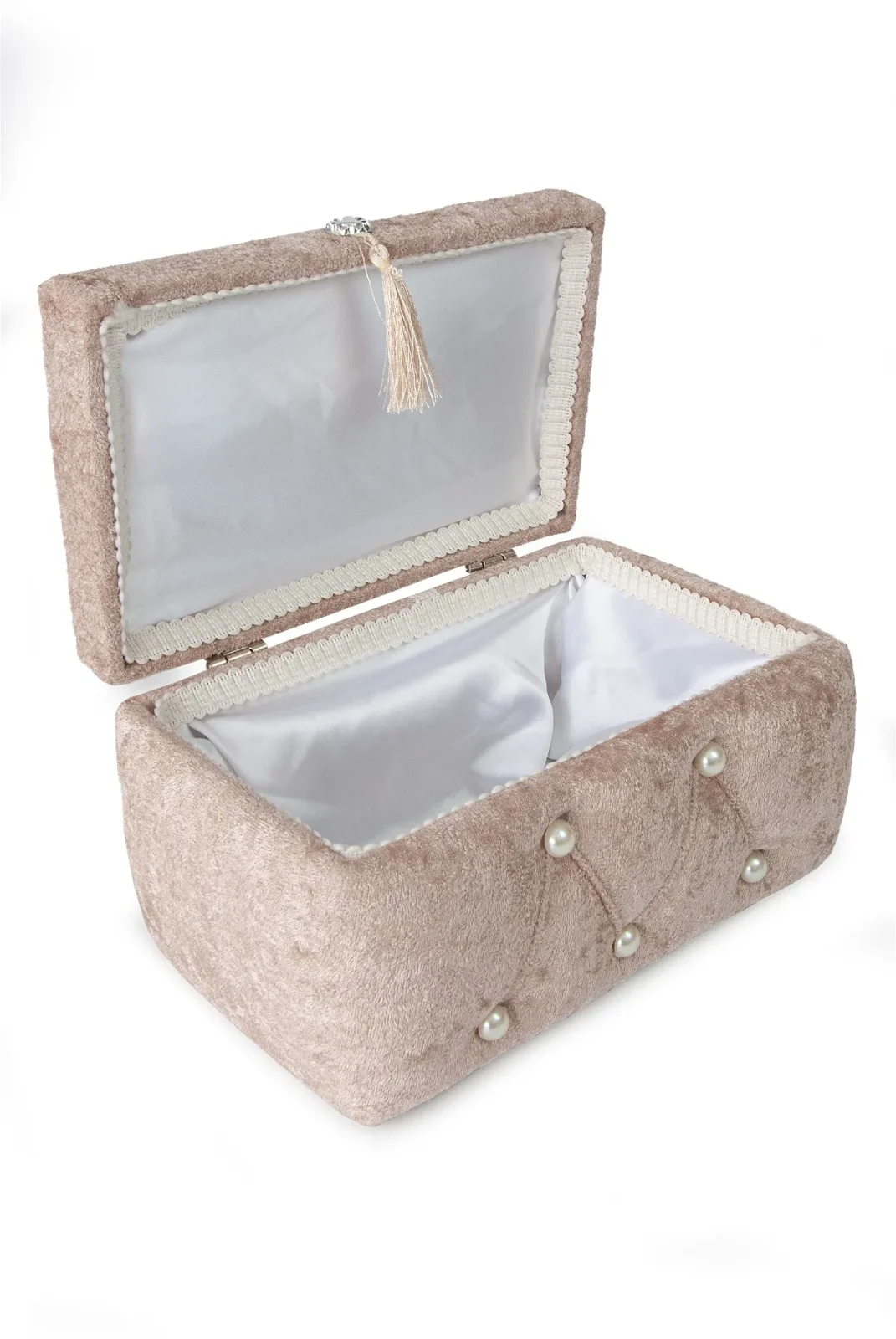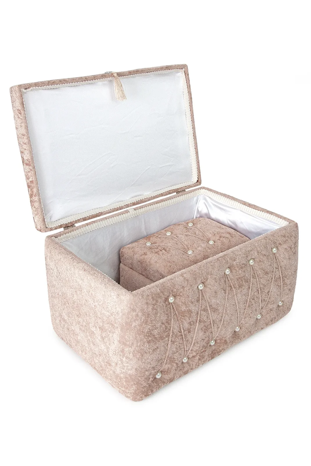 Sıcak kremit rengiyle dikkat çeken kadife ikili gelin sandık seti, özel günlerinizin atmosferine sofistike bir dokunuş katar.