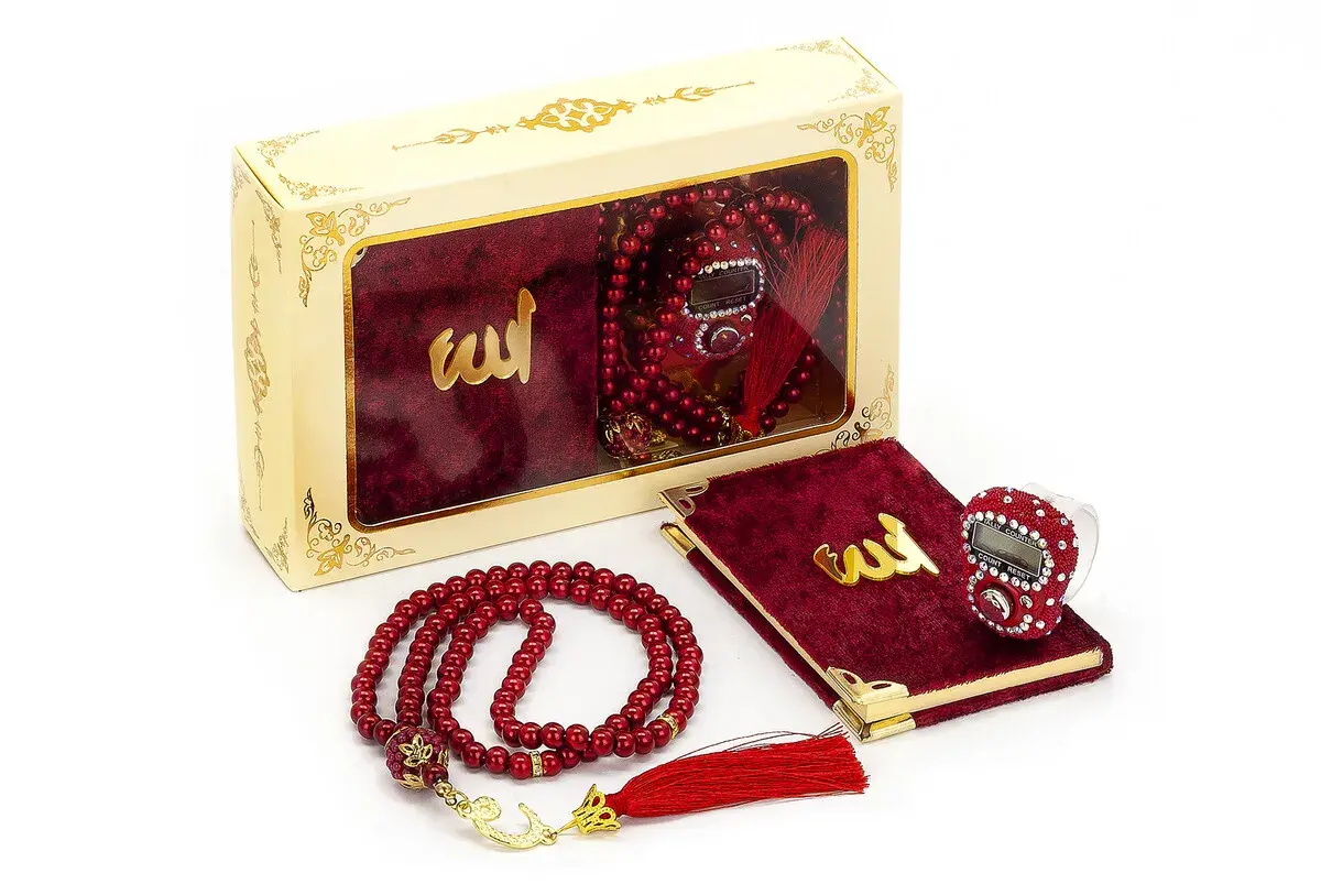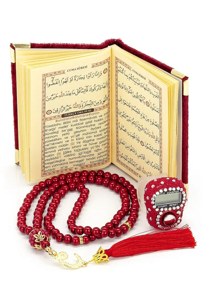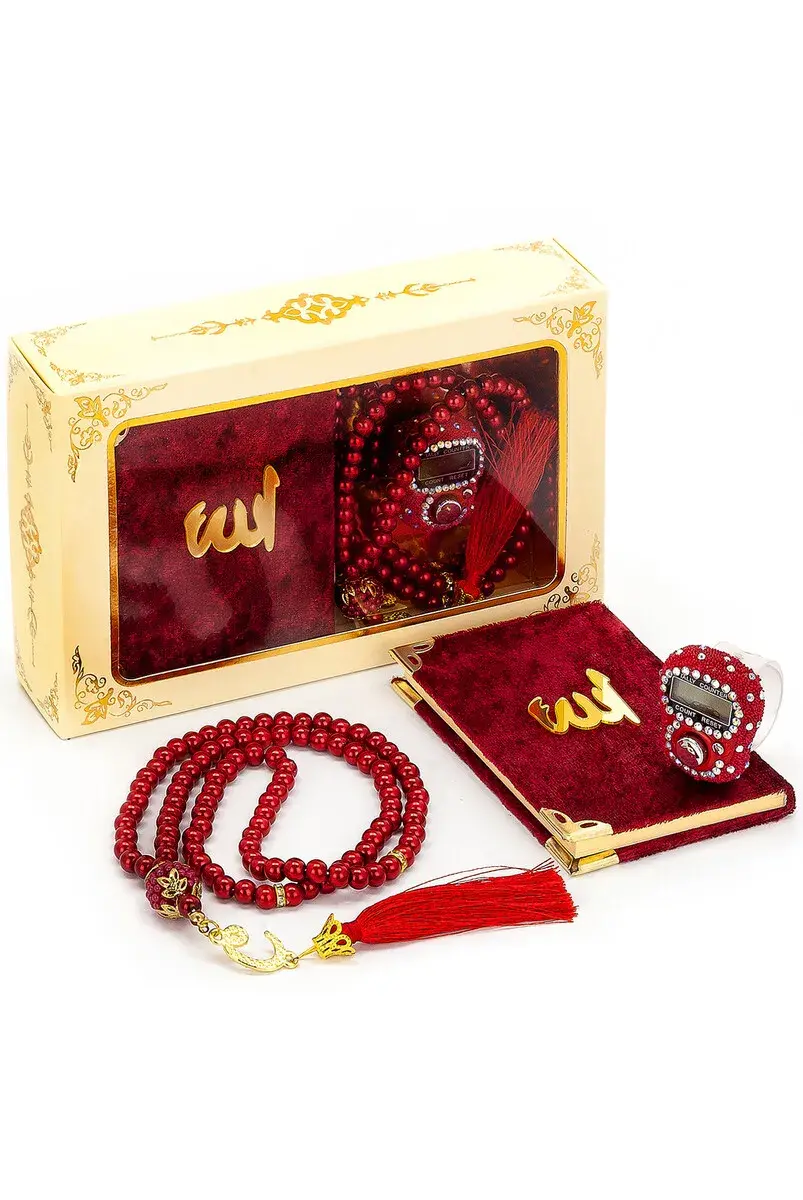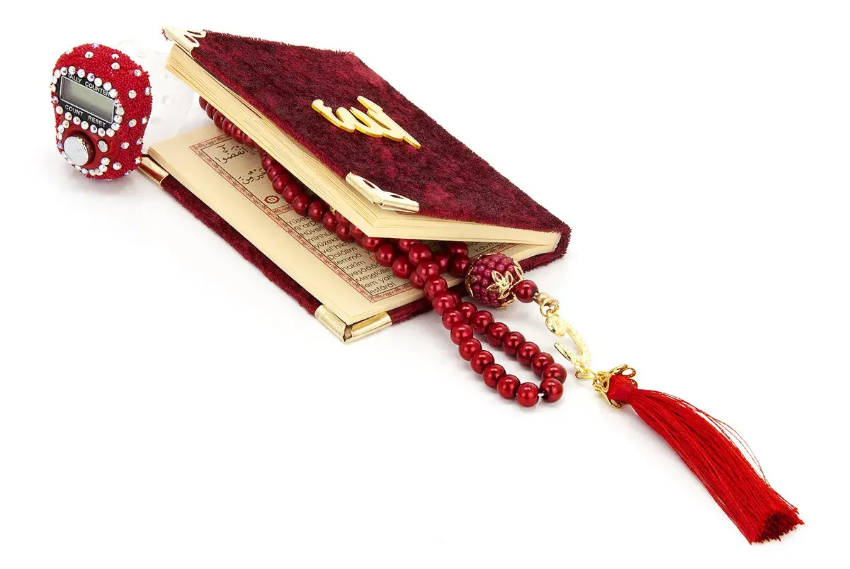 Stone Zikirmatik - Mini Velvet Yasin - Pearl Rosary Gift Set - Claret Red