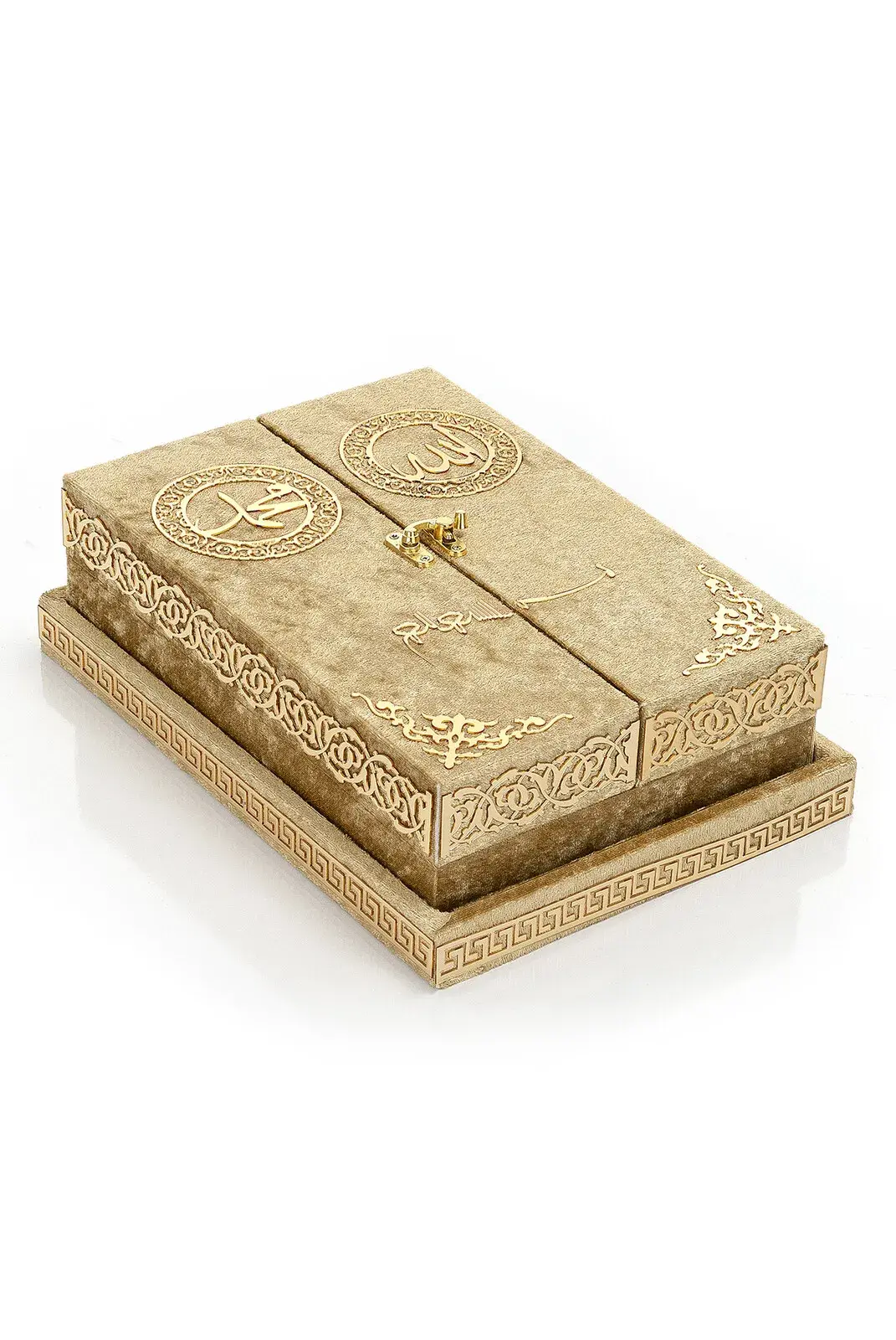 Table Top Double Covered Quran Set With Velvet Covered Chest - Gold